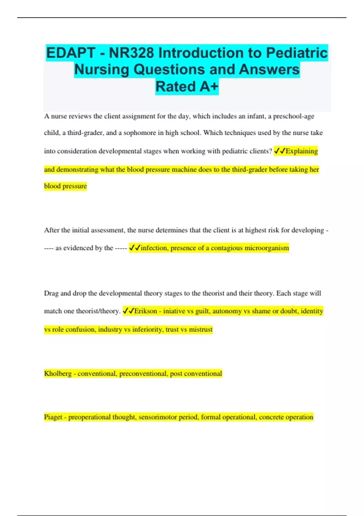 EDAPT - NR328 Introduction to Pediatric Nursing Questions and Answers Rated A+ A nurse reviews the client assignment for the day, which includes an infant, a preschool-age child, a third-grader, and a sophomore in high school. Which techniques used by the nurse take into consideration developmental stages when working with pediatric clients? Explaining and demonstrating what the blood pressure machine does to the third-grader before taking her blood pressure After the initial assessment, the nurse determines that the client is at highest risk for developing - ---- as evidenced by the ----- infection, presence of a contagious microorganism Drag and drop the developmental theory stages to the theorist and their theory. Each stage will match one theorist/theory. Erikson - iniative vs guilt, autonomy vs shame or doubt, identity vs role confusion, industry vs inferiority, trust vs mistrust Kholberg - conventional, preconventional, post conventional Piaget - preoperational thought, sensorimotor period, formal operational, concrete operation Match the age to the expected developmental achievement. 50% of adult height - 2 year old toddler Development of family conflicts - 16 year old Enjoying collecting items - 8 year old Say a few words - 12 month old Visual acuity approaching 20/20 - 5 year old Match the nursing consideration to the appropriate age group. infant - Plan to have caregivers be part of the care. toddler - Fear of mutilation by procedures is common. preschool - Give simple, brief explanations. school-age - Participation in care fosters accomplishment. adolescent - Peer interactions are important. Select the 3 findings that require immediate attention. Caregivers are unaware of the client's sexual activities. The client's boyfriend has penile discharge.