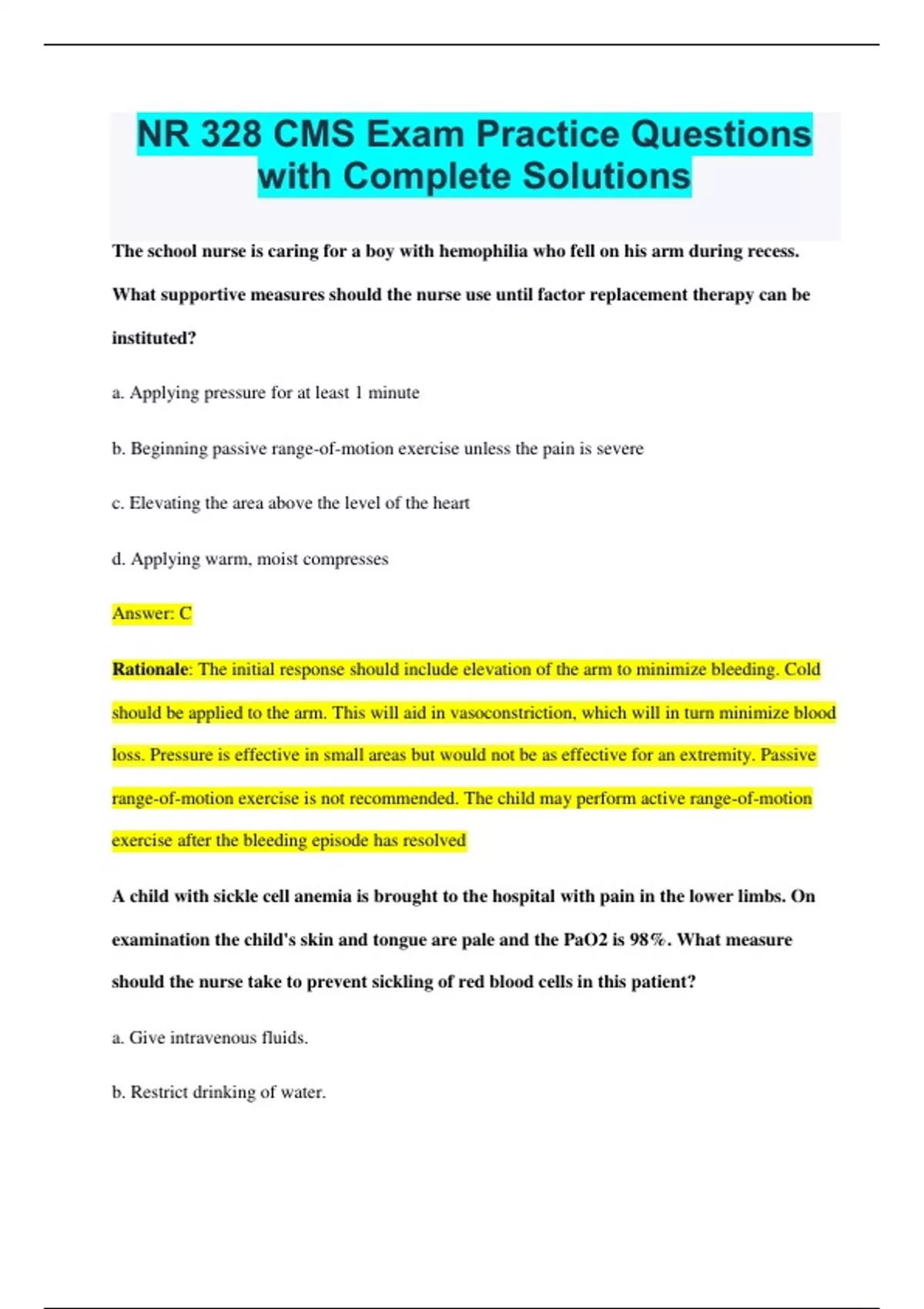 NR 328 CMS Exam Practice Questions with Complete Solutions The school nurse is caring for a boy with hemophilia who fell on his arm during recess. What supportive measures should the nurse use until factor replacement therapy can be instituted? a. Applying pressure for at least 1 minute b. Beginning passive range-of-motion exercise unless the pain is severe c. Elevating the area above the level of the heart d. Applying warm, moist compresses Answer: C Rationale: The initial response should include elevation of the arm to minimize bleeding. Cold should be applied to the arm. This will aid in vasoconstriction, which will in turn minimize blood loss. Pressure is effective in small areas but would not be as effective for an extremity. Passive range-of-motion exercise is not recommended. The child may perform active range-of-motion exercise after the bleeding episode has resolved A child with sickle cell anemia is brought to the hospital with pain in the lower limbs. On examination the child's skin and tongue are pale and the PaO2 is 98%. What measure should the nurse take to prevent sickling of red blood cells in this patient? a. Give intravenous fluids. b. Restrict drinking of water. c. Administer oxygen. d. Give oral analgesics. Answer: A Rationale: Prevention of sickling is an important measure in the management of sickle cellLinks to an external site. crisis. Hydration of the body either through oral or intravenous fluids helps to prevent the sickling phenomenon. The PaO2 of the patient indicates that oxygen saturation is optimal, and therefore oxygen administration is not required. Analgesics are given to reduce pain; however they cannot prevent sickling. Drinking of water should be encouraged. A child with sickle cell disease is brought to the hospital reporting right knee pain. On examination, the nurse finds localized swelling and immediately applies a cold compress to the right knee, massages the knee, and administers ibuprofen for pain relief. The nurse informs the mother that the child may need a high dose of an opioid if there is no relief from pain. Which of the measures taken by the nurse need to be corrected? a. Giving ibuprofen to the child for pain relief b. Giving cold compression to the affected area c. Informing the parent that the child needs a high dose of an opioid d. Massaging the affected area for pain relief Answer: B Rationale: Localized swelling over a joint with arthralgia can occur in some children with sickle cell disease. In such situations a nurse should avoid applying a cold compress to the affected area, as it promotes vasoconstriction leading to sickling of cells. Therefore the nurse should apply heat, massage the affected area, and give analgesics such as ibuprofen for pain relief. Parents should be informed that the child may require a high dose of an opioid if the pain is not relieved and that it is completely safe. For a postoperative patient 6 hours after brain surgery, which potential complications can result from improper positioning? Select all that apply. a. Increased risk for aspiration b. Pressure on the surgical site c. Infection d. Skin breakdown e. Increased intracranial pressure