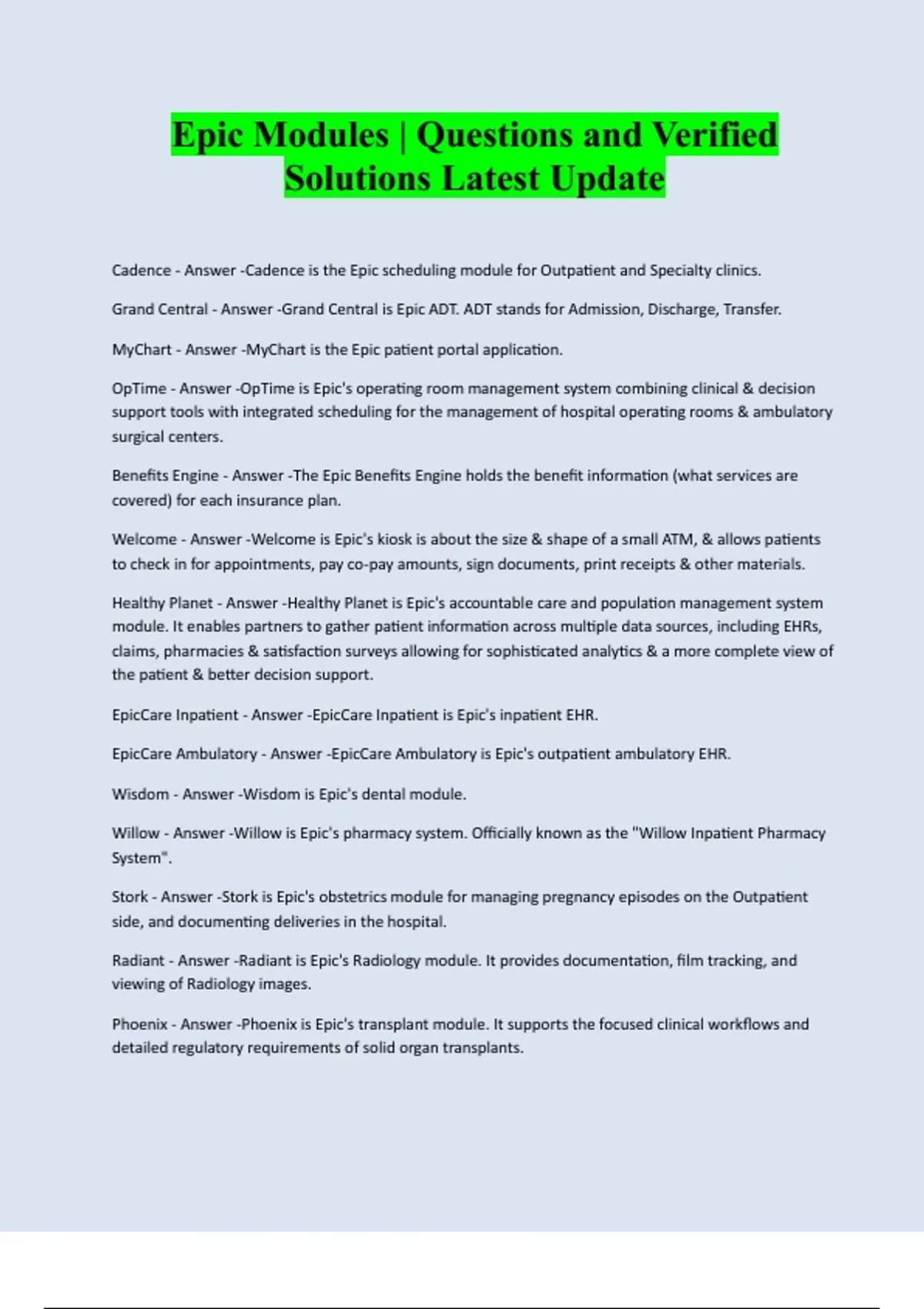 Epic Modules | Questions and Verified Solutions Latest Update Cadence - Answer -Cadence is the Epic scheduling module for Outpatient and Specialty clinics. Grand Central - Answer -Grand Central is Epic ADT. ADT stands for Admission, Discharge, Transfer. MyChart - Answer -MyChart is the Epic patient portal application. OpTime - Answer -OpTime is Epic's operating room management system combining clinical & decision support tools with integrated scheduling for the management of hospital operating rooms & ambulatory surgical centers. Benefits Engine - Answer -The Epic Benefits Engine holds the benefit information (what services are covered) for each insurance plan. Welcome - Answer -Welcome is Epic's kiosk is about the size & shape of a small ATM, & allows patients to check in for appointments, pay co-pay amounts, sign documents, print receipts & other materials. Healthy Planet - Answer -Healthy Planet is Epic's accountable care and population management system module. It enables partners to gather patient information across multiple data sources, including EHRs, claims, pharmacies & satisfaction surveys allowing for sophisticated analytics & a more complete view of the patient & better decision support. EpicCare Inpatient - Answer -EpicCare Inpatient is Epic's inpatient EHR. EpicCare Ambulatory - Answer -EpicCare Ambulatory is Epic's outpatient ambulatory EHR. Wisdom - Answer -Wisdom is Epic's dental module. Willow - Answer -Willow is Epic's pharmacy system. Officially known as the "Willow Inpatient Pharmacy System". Stork - Answer -Stork is Epic's obstetrics module for managin