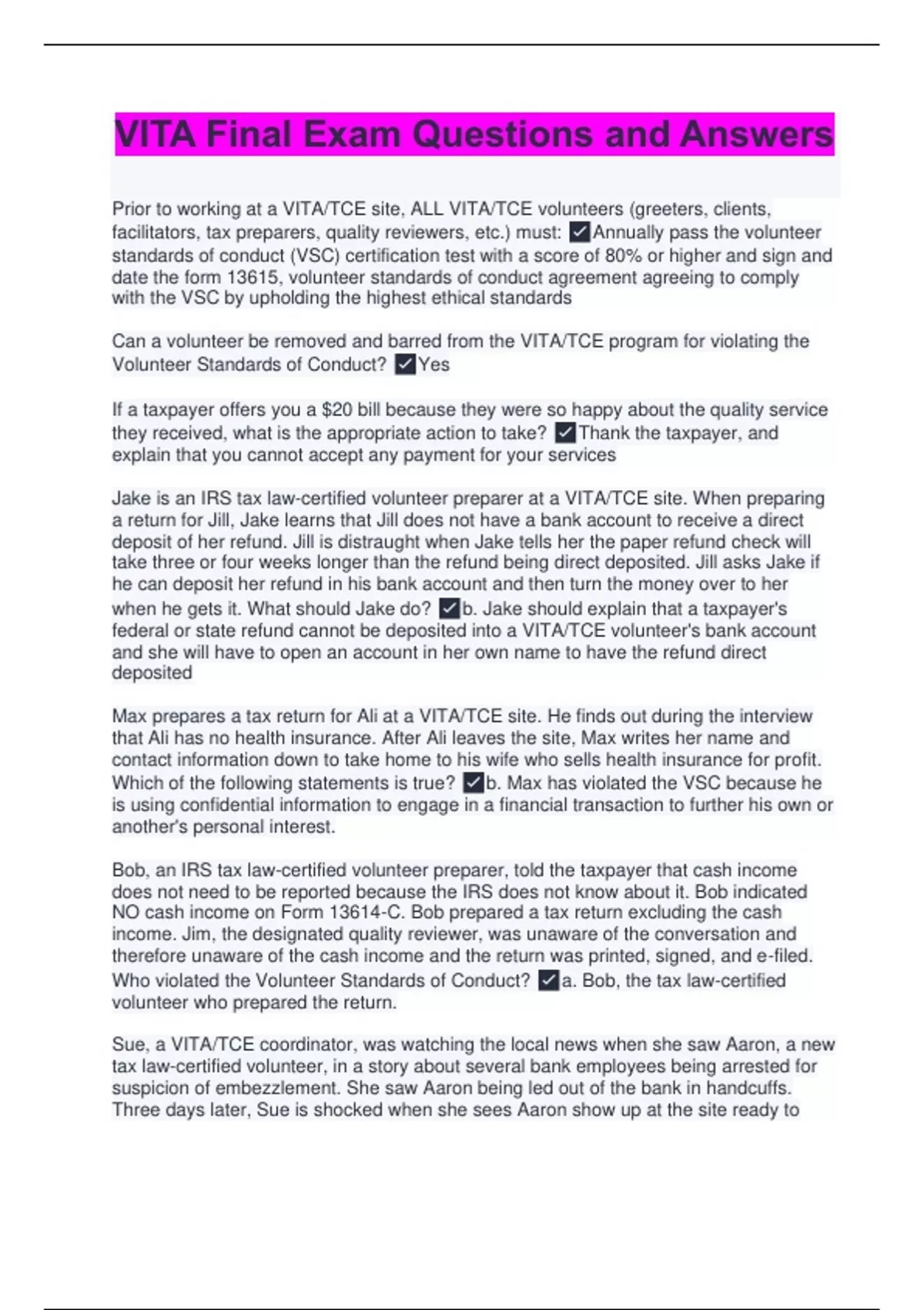 Prior to working at a VITA/TCE site, ALL VITA/TCE volunteers (greeters, clients, facilitators, tax preparers, quality reviewers, etc.) must: Annually pass the volunteer standards of conduct (VSC) certification test with a score of 80% or higher and sign and date the form 13615, volunteer standards of conduct agreement agreeing to comply with the VSC by upholding the highest ethical standards Can a volunteer be removed and barred from the VITA/TCE program for violating the Volunteer Standards of Conduct? Yes If a taxpayer offers you a $20 bill because they were so happy about the quality service they received, what is the appropriate action to take? Thank the taxpayer, and explain that you cannot accept any payment for your services Jake is an IRS tax law-certified volunteer preparer at a VITA/TCE site. When preparing a return for Jill, Jake learns that Jill does not have a bank account to receive a direct deposit of her refund. Jill is distraught when Jake tells her the paper refund check will take three or four weeks longer than the refund being direct deposited. Jill asks Jake if he can deposit her refund in his bank account and then turn the money over to her when he gets it. What should Jake do? b. Jake should explain that a taxpayer's federal or state refund cannot be deposited into a VITA/TCE volunteer's bank account and she will have to open an account in her own name to have the refund direct deposited Max prepares a tax return for Ali at a VITA/TCE site. He finds out during the interview that Ali has no health insurance. After Ali leaves the site, Max writes her name and contact information down to take home to his wife who sells health insurance for profit. Which of the following statements is true? b. Max has violated the VSC because he is using confidential information to engage in a financial transaction to further his own or another's personal interest. Bob, an IRS tax law-certified volunteer preparer, told the taxpayer that cash income does not need to be reported because the IRS does not know about it. Bob indicated NO cash income on Form 13614-C. Bob prepared a tax return excluding the cash income. Jim, the designated quality reviewer, was unaware of the conversation and therefore unaware of the cash income and the return was printed, signed, and e-filed. Who violated the Volunteer Standards of Conduct? a. Bob, the tax law-certified volunteer who prepared the return