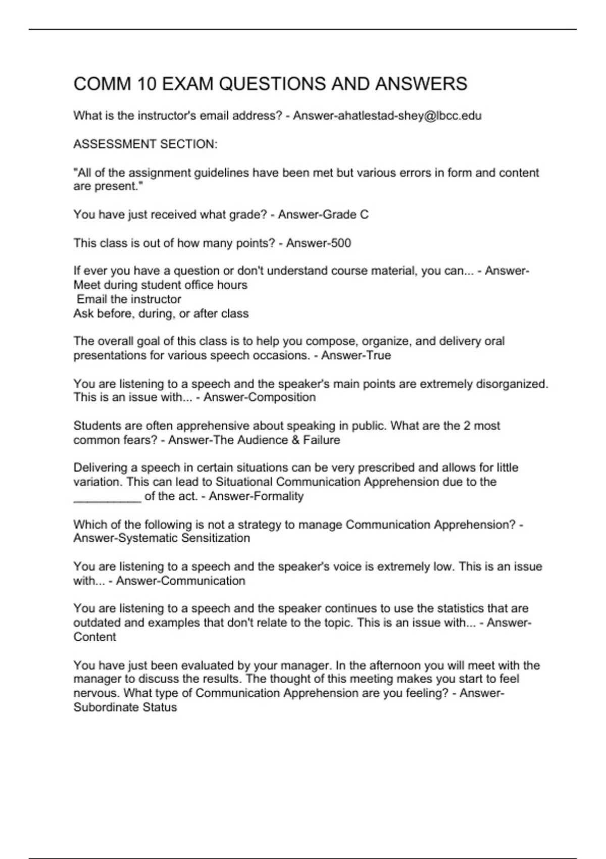 What is the instructor's email address? - ASSESSMENT SECTION: "All of the assignment guidelines have been met but various errors in form and content are present." You have just received what grade? - Answer-Grade C This class is out of how many points? - Answer-500 If ever you have a question or don't understand course material, you can... - Answer-Meet during student office hours Email the instructor Ask before, during, or after class The overall goal of this class is to help you compose, organize, and delivery oral presentations for various speech occasions. - Answer-True You are listening to a speech and the speaker's main points are extremely disorganized. This is an issue with... - Answer-Composition Students are often apprehensive about speaking in public. What are the 2 most common fears? - Answer-The Audience & Failure Delivering a speech in certain situations can be very prescribed and allows for little variation. This can lead to Situational Communication Apprehension due to the __________ of the act. - Answer-Formality Which of the following is not a strategy to manage Communication Apprehension? - Answer-Systematic Sensitization You are listening to a speech and the speaker's voice is extremely low. This is an issue with... - Answer-Communication You are listening to a speech and the speaker continues to use the statistics that are outdated and examples that don't relate to the topic. This is an issue with... - Answer-Content You have just been evaluated by your manager. In the afternoon you will meet with the manager to discuss the results. The thought of this meeting makes you start to feel nervous. What type of Communication Apprehension are you feeling? - Answer-Subordinate Status T