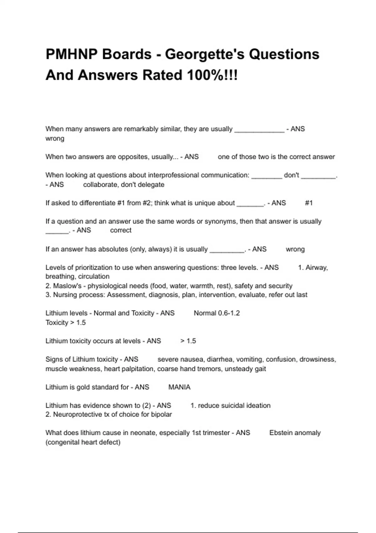 When many answers are remarkably similar, they are usually _____________ - ANS wrong When two answers are opposites, usually... - ANS one of those two is the correct answer When looking at questions about interprofessional communication: ________ don't _________. - ANS collaborate, don't delegate If asked to differentiate #1 from #2; think what is unique about _______. - ANS #1 If a question and an answer use the same words or synonyms, then that answer is usually ______. - ANS correct If an answer has absolutes (only, always) it is usually _________. - ANS wrong Levels of prioritization to use when answering questions: three levels. - ANS 1. Airway, breathing, circulation 2. Maslow's - physiological needs (food, water, warmth, rest), safety and security 3. Nursing process: Assessment, diagnosis, plan, intervention, evaluate, refer out last Lithium levels - Normal and Toxicity - ANS Normal 0.6-1.2 Toxicity > 1.5 Lithium toxicity occurs at levels - ANS > 1.5 Signs of Lithium toxicity - ANS severe nausea, diarrhea, vomiting, confusion, drowsiness, muscle weakness, heart palpitation, coarse hand tremors, unsteady gait Lithium is gold standard for - ANS MANIA Lithium has evidence shown to (2) - ANS 1. reduce suicidal ideation 2. Neuroprotective tx of choice for bipolar What does lithium cause in neonate, especially 1st trimester - ANS Ebstein anomaly (congenital heart defect) dehydration and hyponatremia cause lithium levels to - ANS rise Baseline labs before initiation of lithium - ANS TSH creatinine (0.6-1.2) BUN (10-20) HCG (all psychotropics females 12-51) EKG 50+ Side Effects of Lithium and lithium toxicity - ANS SIde Effects: hypothyroidism, coarse hand tremors with toxicity, diarrhea, leukocytosis Toxicity: N/V, confusion, convulsions, drowsiness, blurred vision, slurred speech, mm weakness, heart palpitations, course hand tremors, and unsteadiness when walking (STOP and check levels) Why are elderly more sensitive to lithium (5) - ANS Decreased intercellular water, protein binding, mm mass, and metabolism Increased body fat MAOI + tyramine causes - ANS hypertensive crisis - life threatening and emergency Symptoms of hypertensive crisis - ANS elevated BP sudden explosive occipital headache facial flushing palpitations pupillary dilation diaphoresis fever