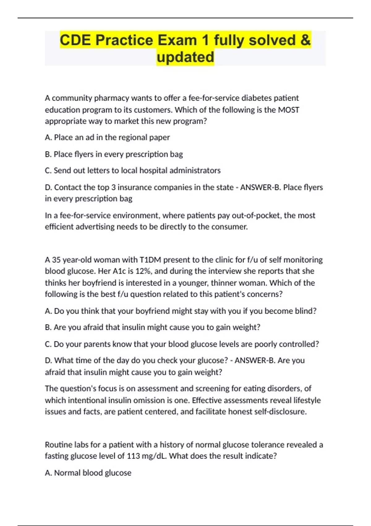 A community pharmacy wants to offer a fee-for-service diabetes patient education program to its customers. Which of the following is the MOST appropriate way to market this new program? A. Place an ad in the regional paper B. Place flyers in every prescription bag C. Send out letters to local hospital administrators D. Contact the top 3 insurance companies in the state - ANSWER-B. Place flyers in every prescription bag In a fee-for-service environment, where patients pay out-of-pocket, the most efficient advertising needs to be directly to the consumer. A 35 year-old woman with T1DM present to the clinic for f/u of self monitoring blood glucose. Her A1c is 12%, and during the interview she reports that she thinks her boyfriend is interested in a younger, thinner woman. Which of the following is the best f/u question related to this patient's concerns? A. Do you think that your boyfriend might stay with you if you become blind? B. Are you afraid that insulin might cause you to gain weight? C. Do your parents know that your blood glucose levels are poorly controlled? D. What time of the day do you check your glucose? - ANSWER-B. Are you afraid that insulin might cause you to gain weight? The question's focus is on assessment and screening for eating disorders, of which intentional insulin omission is one. Effective assessments reveal lifestyle issues and facts, are patient centered, and facilitate honest self-disclosure. Routine labs for a patient with a history of normal glucose tolerance revealed a fasting glucose level of 113 mg/dL. What does the result indicate? A. Normal blood glucose B. Impaired fasting glucose C. Diabetes D. Gestational diabetes - ANSWER-B. Impaired fasting glucose A blood glucose level between 100 and 125 mg/dL indicates impaired fasting glucose. A normal fasting glucose is 100 gm/dL and diabetes is indicated by a fasting blood glucose of 126 mg/dL. SQ presents for a routine visit. While performing a foot exam you note "dependent rubber" (swelling and redness) when his feet are in a dependent position and pallor on elevation. You suspect: A. diabetic neuropathy B. peripheral arterial disease C. varicose veins D. Charcot joint - ANSWER-B. peripheral arterial disease Swelling and redness when the feet hang down are signs of poor circulation and peripheral vascular disease. Diabetic neuropathy may accompany peripheral vascular disease; however these visually observable changes are not usually present. Varicose veins and Charcot joint are also not usual causes of foot swelling and redness. An individual newly diagnosed with T2DM presents for education. What should the educator do first? A. Provide a detailed overview of the pathophysiology of T2DM. B. Assess the individual's interests, needs, and problems C. Discuss chronic complication risk D. Review a carbohydrate counting meal plan - ANSWER-B. Assess the individual's interests, needs, and problems Assessment is the first step in the process of providing diabetes education. By understanding what the interests, needs, and problems of the person with diabetes are, the educator is more likely to provide appropriate and useful information that will assist the individual to meet desired outcomes. The other choices may well become part of the education plan, but this follows assessment. Which of the following medications should NOT be used in pregnancy? A. Human insulin B. Metformin C. Methlydopa D. HMG-CoA reducates inhibitors - ANSWER-D. HMG-CoA reductase inhibitors Statin drugs are category X and should not be used in pregnant women. Insulin, metformin, and methyldopa have adequate safety date to support use during pregnancy. A patient tells you that he wants to verify the accuracy of his meter. You tell him that the testing (meter vs laboratory determination) A. should be done in a fasting state B. is valid as long as he performs the testing 1 hour or less apart C. result will be ~15% higher than the laboratory value if his meter reports whole blood glucose level values D. should be done simultaneously using a drop of blood from the venipuncture - ANSWER-A. should be done in a fasting state When verifying the accuracy of a meter, the bg meter results should be compared against a laboratory value, not another meter. Only fasting values can be measured since postal values will differ between the capillary blood (as measured on the meter) and the venous blood (as measure in the lab). These should be done at the same time. The meter result would be ~15% LOWER than the laboratory result if the meter reports whole blood glucose values. Applying a drop of blood from the venipuncture needle is not acceptable, as the meter strips will give false reading if venous blood is used. FN has T1DM. When is testing for ketones the most appropriate? A. Daily in the morning after an overnight fast B. Prior to a decrease in insulin dosage C. With consistently elevated bg D. Prior to exercise - ANSWER-C. with consistently elevated bg Ketone testing is appropriate during illness, when bg levels are consistently elevated, during weight loss and pregnancy. A 73 year old man with T2DM presents to the clinic complaining that he cannot pay for his medications any longer. He reports that one of his prescriptions went up from $5 to $100. Which of the following additional questions would be MOST helpful in assessing this problem? A. Did you go to a different chain pharmacy? B. Did you recently change insurance? C. When was the last time you had any prescriptions filled? D. Did you ask for a 3-month supply? - ANSWER-B. Did you recently change insurance? Effective assessments should reveal potential barriers to self-mgmt. Financial concerns and a alack of adequate insurance represent a major obstacle to care and therefore would be the appropriate place to begin. A single mother with T2DM is treated with 3 oral agents plus a bedtime injection of glargine. She presents to the clinic appearing disheveled. Her bg log reveals widely fluctuating bg values d