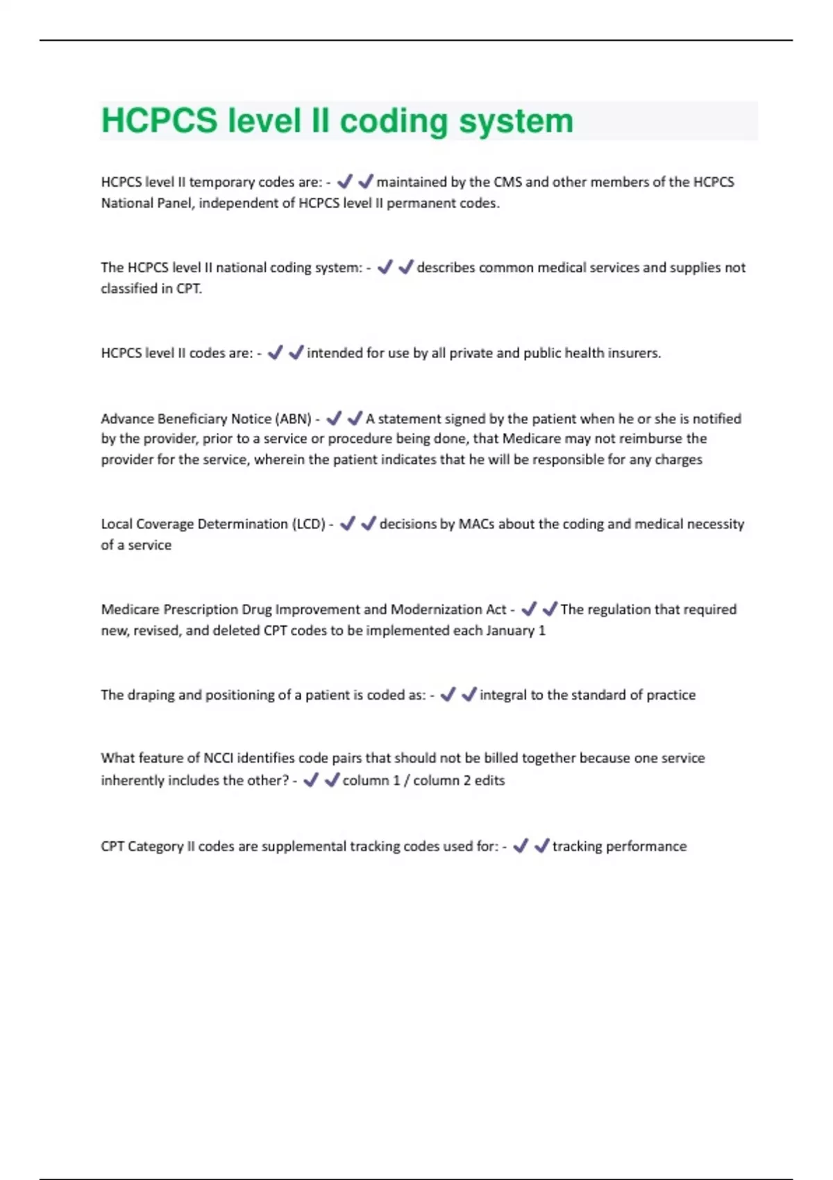 HCPCS level II temporary codes are: - maintained by the CMS and other members of the HCPCS National Panel, independent of HCPCS level II permanent codes. The HCPCS level II national coding system: - describes common medical services and supplies not classified in CPT. HCPCS level II codes are: - intended for use by all private and public health insurers. Advance Beneficiary Notice (ABN) - A statement signed by the patient when he or she is notified by the provider, prior to a service or procedure being done, that Medicare may not reimburse the provider for the service, wherein the patient indicates that he will be responsible for any charges Local Coverage Determination (LCD) - decisions by MACs about the coding and medical necessity of a service Medicare Prescription Drug Improvement and Modernization Act - The regulation that required new, revised, and deleted CPT codes to be implemented each January 1 The draping and positioning of a patient is coded as: - integral to the standard of practice What feature of NCCI identifies code pairs that should not be billed together because one service inherently includes the other? - column 1 / column 2 edits CPT Category II codes are supplemental tracking codes used for: - tracking performance