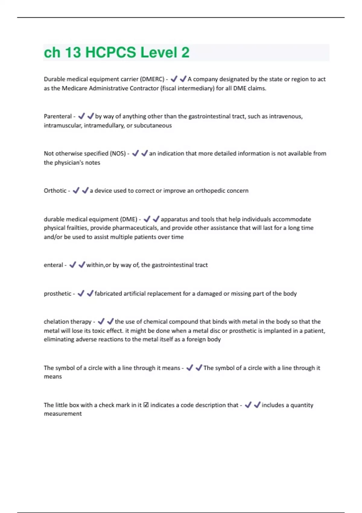 Durable medical equipment carrier (DMERC) - A company designated by the state or region to act as the Medicare Administrative Contractor (fiscal intermediary) for all DME claims. Parenteral - by way of anything other than the gastrointestinal tract, such as intravenous, intramuscular, intramedullary, or subcutaneous Not otherwise specified (NOS) - an indication that more detailed information is not available from the physician's notes Orthotic - a device used to correct or improve an orthopedic concern durable medical equipment (DME) - apparatus and tools that help individuals accommodate physical frailties, provide pharmaceuticals, and provide other assistance that will last for a long time and/or be used to assist multiple patients over time enteral - within,or by way of, the gastrointestinal tract prosthetic - fabricated artificial replacement for a damaged or missing part of the body chelation therapy - the use of chemical compound that binds with metal in the body so that the metal will lose its toxic effect. it might be done when a metal disc or prosthetic is implanted in a patient, eliminating adverse reactions to the metal itself as a foreign body The symbol of a circle with a line through it means - The symbol of a circle with a line through it means The little box with a check mark in it ☑ indicates a code description that - includes a quantity measurementThe J codes are used to bill insurance carriers for - drugs administered by a health care professional. HCPCS Level II codes are used, most often, to report all except - anesthesia administered by an anesthesiologist. The acronym DME stands for - durable medical equipment. HCPCS Level II codes are presented as - one letter followed by four numbers. HCPCS is an acronym that stands for - Health care Common Procedure Coding System. The code D1110 is an example of a - HCPCS Level II code. The D0000-D9999 codes are created and maintained by the - American Dental Association. HCPCS Level II Appendix 5 provides additional information on - new, changed, deleted, and reinstated HCPCS codes The E codes shown in the HCPCS Level II book are - used to identify DME provided to a patient An example of DME is - a three-prong cane A line through the center of a code and its description means - the code has been deleted and may no longer be used Alcohol intervention treatment might be coded from - H0001-H2037 A code with an A next to it means that - the service is limited to a specific age groupSee Also Code - This notation cross-references this code with another code that may be similar in description. The notation serves as a reminder for you to double-check that you are using the most accurate code. Clarifications of Coverage - This notation indicates when to use or not use the code. Report in Addition to Code - When one code is to be reported with other codes, this notation will identify those circumstances. It not only tells you the circumstances but also tells you which code to use. See Code(s) - Refers you to a CPT code for a description that is potentially better and may be more specific for reporting what was actually done or given to the patient. Determine if an Alternative HCPCS Level 2 or a CPT Code Better Describes - Serves as a warning to you to make certain that there is no better or more specific code in either the CPT or elsewhere in this HCPCS Level II book that correctly reports the services or procedures performed. Use this code for - Provides you with alternative names, brand names, and other terms that are also represented by the code's description. Pertinent Documentation to Evaluate Medical Appropriatness should be - Warns you up front that you should include the proper documentation along with the claim the first time you submit it, rather than wait to be asked by the third-party payer, which would delay payment. do not use this code to report - Warns you of circumstances when you are not permitted to use a code. medicare covers - This notation gives you information about coverage, particularly Medicare and Medicaid coverage. code with caution - This notation warns that you need to go back and double-check the provider's notes carefully. If this is what was actually done, then be certain to attach documentation explaining why that method was used instead of the newer technique because it is surely going to be s report concurrent to the xxx procedure - This notation directs you to always report this code with a code for another specific procedure. a large bullet, or solid circle - Indicates that it is the first year that the code is included in this code set. a solid triangle - Let's you know that the code's description has been changed or adjusted since last year or that a rule or guideline regarding the code has changed. an open circle - Identifies that the code had been deleted but now has been restored (reinstated). a circle with a slash through it - in the HCPCS Level II book, identifies a code that is not covered under the skilled nursing facility (SNF) prospective payment system (PPS). a check mark inside a square box marks - A code description that identifies a specific quantity of material or supply "A" symbol - Highlights the fact that a code is used only for procedures, services, and equipment performed or used on a patient of a certain age group "M" symbol - Reminds you that the code describes maternity procedures, services, and equipment performed or used on a pregnant female 12-55 years of age.