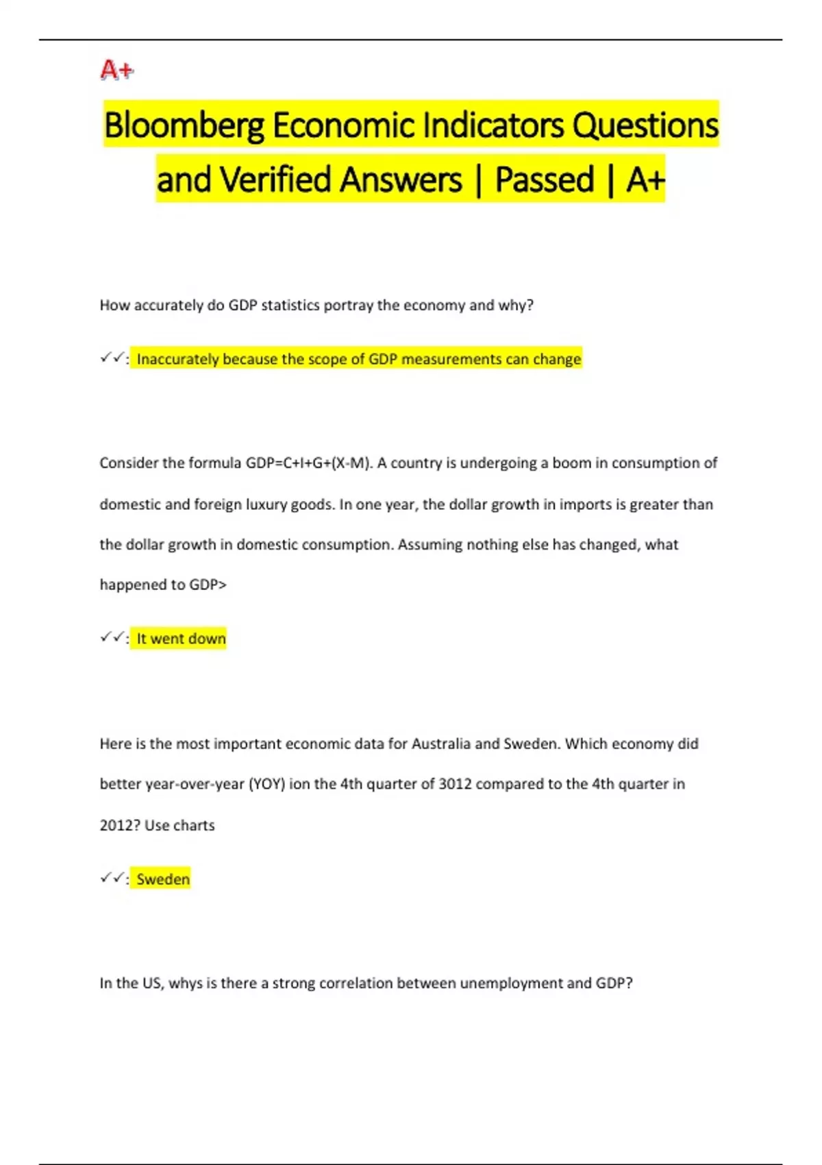 Bloomberg Economic Indicators Questions and Verified Answers | Passed | A+