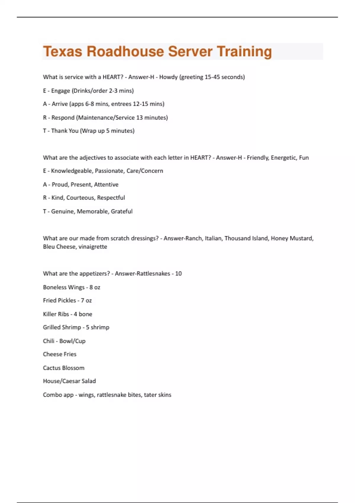 What is service with a HEART? - Answer-H - Howdy (greeting 15-45 seconds) E - Engage (Drinks/order 2-3 mins) A - Arrive (apps 6-8 mins, entrees 12-15 mins) R - Respond (Maintenance/Service 13 minutes) T - Thank You (Wrap up 5 minutes) What are the adjectives to associate with each letter in HEART? - Answer-H - Friendly, Energetic, Fun E - Knowledgeable, Passionate, Care/Concern A - Proud, Present, Attentive R - Kind, Courteous, Respectful T - Genuine, Memorable, Grateful What are our made from scratch dressings? - Answer-Ranch, Italian, Thousand Island, Honey Mustard, Bleu Cheese, vinaigrette What are the appetizers? - Answer-Rattlesnakes - 10 Boneless Wings - 8 oz Fried Pickles - 7 oz Killer Ribs - 4 bone Grilled Shrimp - 5 shrimp Chili - Bowl/Cup Cheese Fries Cactus Blossom House/Caesar Salad Combo app - wings, rattlesnake bites, tater skinsWhat is Our Story? - Answer-Hand-Cut Steaks, Fall-Off-The-Bone Ribs, Fresh-Baked Bread, Made-FromScratch Sides and Dressings, Ice-Cold Beers, and Legendary Margaritas What are the sides? - Answer-Steak Fries, Green Beans, Baked Potato, Sweet Potato, Mashed Potato, House/Caesar Dressing, Veggies/Corn, Apple Sauce, Seasoned Rice, Chili What is a Smother? - Answer-Jack Cheese, Onions, Mushrooms, and Gravy What is a load? - Answer-Bacon and Cheese What sauce is served with the cactus blossom? - Answer-Cajun Horseradish What sauce is served with the cheese fries - Answer-Ranch/(Jalapenos if asked) What sauce is served with the tater skins? - Answer-Sour Cream What sauce is served with the Boneless Wings? - Answer-Bleu Cheese