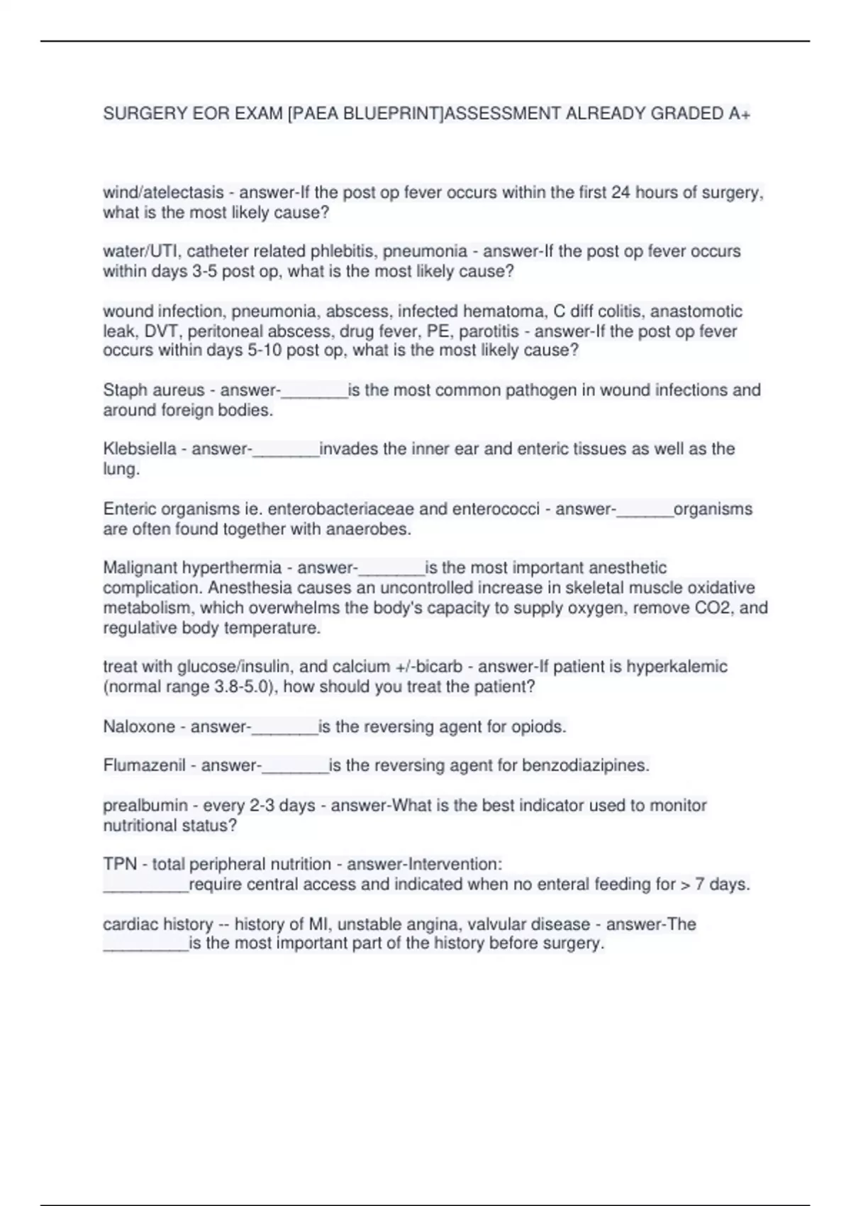SURGERY EOR EXAM [PAEA BLUEPRINT]ASSESSMENT ALREADY GRADED A+ wind/atelectasis - answer-If the post op fever occurs within the first 24 hours of surgery, what is the most likely cause? water/UTI, catheter related phlebitis, pneumonia - answer-If the post op fever occurs within days 3-5 post op, what is the most likely cause? wound infection, pneumonia, abscess, infected hematoma, C diff colitis, anastomotic leak, DVT, peritoneal abscess, drug fever, PE, parotitis - answer-If the post op fever occurs within days 5-10 post op, what is the most likely cause? Staph aureus - answer-_______is the most common pathogen in wound infections and around foreign bodies. Klebsiella - answer-_______invades the inner ear and enteric tissues as well as the lung. Enteric organisms ie. enterobacteriaceae and enterococci - answer-______organisms are often found together with anaerobes. Malignant hyperthermia - answer-_______is the most important anesthetic complication. Anesthesia causes an uncontrolled increase in skeletal muscle oxidative metabolism, which overwhelms the body's capacity to supply oxygen, remove CO2, and regulative body temperature. treat with glucose/insulin, and calcium +/-bicarb - answer-If patient is hyperkalemic (normal range 3.8-5.0), how should you treat the patient? Naloxone - answer-_______is the reversing agent for opiods. Flumazenil - answer-_______is the reversing agent for benzodiazipines. prealbumin - every 2-3 days - answer-What is the best indicator used to monitor nutritional status? TPN - total peripheral nutrition - answer-Intervention: _________require central access and indicated when no enteral feeding for > 7 days. cardiac history -- history of MI, unstable angina, valvular disease - answer-The _________is the most important part of the history before surgery.