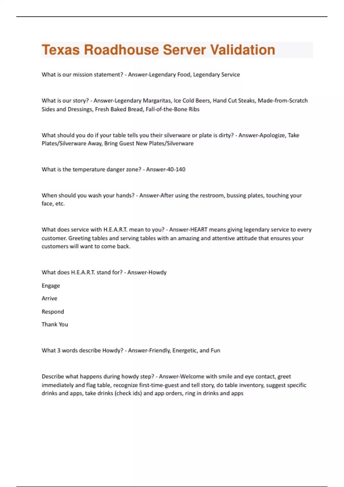 What is our mission statement? - Answer-Legendary Food, Legendary Service What is our story? - Answer-Legendary Margaritas, Ice Cold Beers, Hand Cut Steaks, Made-from-Scratch Sides and Dressings, Fresh Baked Bread, Fall-of-the-Bone Ribs What should you do if your table tells you their silverware or plate is dirty? - Answer-Apologize, Take Plates/Silverware Away, Bring Guest New Plates/Silverware What is the temperature danger zone? - Answer-40-140 When should you wash your hands? - Answer-After using the restroom, bussing plates, touching your face, etc. What does service with H.E.A.R.T. mean to you? - Answer-HEART means giving legendary service to every customer. Greeting tables and serving tables with an amazing and attentive attitude that ensures your customers will want to come back. What does H.E.A.R.T. stand for? - Answer-Howdy Engage Arrive Respond Thank You What 3 words describe Howdy? - Answer-Friendly, Energetic, and Fun Describe what happens during howdy step? - Answer-Welcome with smile and eye contact, greet immediately and flag table, recognize first-time-guest and tell story, do table inventory, suggest specific drinks and apps, take drinks (check ids) and app orders, ring in drinks and appsHow long do you have to greet your table? - Answer-15-45 sec What should you check for when greeting your table? - Answer-plates, silverware, bread, peanuts What three words describe engage? - Answer-knowledgeable, passionate, care/concern What happens during the engage step? - Answer-serve drinks, use drink name and offer straws, offer menu assistance, suggestively sell/upsell, take order with pivot points, repeat order, describe steak temps, refill bread (if needed), ring in order How long do you have to ring in drinks? - Answer-2-3 min What to do if your table gives you an appetizer order and entrée order at the same time? - Answer-Wait 5 minutes to ring in food or wait till appetizer is delivered to table What items should you be suggesting? - Answer-upsells (loadings like mushrooms/onions, cheese and bacon, or marshmallows and caramel), drinks from bar How long should it take you to ring in drinks/apps/entrees? - Answer-2-3 min What are the foundations of service of H.E.A.R.T.? - AnswerWhy are they so important? - AnswerWhat are some key points when taking a guests order? - Answer-use pivot points, make eye contact, repeat order, describe steak temps What is a pivot point? Why is it important? - Answer-A pivot point is the seating order of guest. It makes it so that food does not auction off food.What is pre-bussing and why is it important? - Answer-it is removing dirty plates and silverware and trash off of tables during and after a guest meal. It makes the SA's job faster and easier. What appetizers do we offer? - Answer-cactus blossom, fried pickles, rattlesnake bites, tater skins, grilled shrimp, boneless buffalo wings, cheese fries, killer ribs, texas red chili, combo appetizer (three of: boneless wings, rattlesnake bites, tater skins, or fried pickles... two dipping sides) What side items do we offer? - Answer-applesauce, baked potato, buttered corn, fresh veggies, green beans, mashed potatoes, seasoned rice, steak fries, sweet potato, texas red chili, sautéed onions, sautéed mushrooms What kids meals do we offer? - Answer-kids: hot dog, mac and cheese, mini-cheeseburgers, jr. chicken tenders, grilled chicken, lil' dillo steak bites ranger: chicken critter basket, andy's steak, ranger rib basket What is the difference between a kid's meal and ranger meals? - Answer-kids meal are for 12 and under ranger meal are for kids with larger appetites What is our non-alcoholic glasses served in? - Answer-coke glasses or kids cup What bottled beer do we have? - Answer-Blue Moon, Budweiser, Bud Light, Michelob Ultra, Miller Lite, Coors Light, Corona, Corona Light, dos Equis, Heineken, O'Doul's, Sam Adams Angry Orchard, Sam Adams Boston Lager, Stella Artois, Twisted Tea What draft beers do we offer? - Answer-Budlight, Budweiser, Coors Light, Michelob Ultra, Miller Lite, Texas Red, Sam Adams Seasonal, Shock Top, Yuengling What comes in our house margarita mix? - Answer-Juarez gold, Juarez silver, Agile nectar, Juarez Triple Sec, Margarita Silver Tequila, Orange Juice What flavors best come served on the rocks? Frozen? - Answer-Rocks: Jamaican Cowboy, Hurricane, Razzlesnake, Roadhouse Roadie Frozen: Strawberry, Coconut, Peach, SangariaWhat is a kicker? - Answer-A margarita enhancer What is an alley rally? - Answer-A server meeting to get the servers excited for the shift Name 3 of our top 10 service priorities - Answer-knowledgeable servers, sense of fun, urgency on greetings, drinks and food, manager table visits, 3 table stations What are our core values? - Answer-fun, integrity, passion, partnership What are our operational goals? - Answer-manager in window, training, host focus, first time guest, image, alley rally What are some examples of running sidework? - Answer-food running, bread plates, replacing beverage naps, ice Why is running side work important? - Answer-teamwork, keeps restaurant running fuctionally What are 3 words to describe arrive? - Answer-proud, present, attentive What is going on in arrive? - Answer-delivered apps, salads, and entrees, refill drinks and bread, check back after 2 minutes to validate order, accommodate needs, pre-bus unused items How long do you have to deliver appetizers? - Answer-6-8 min how long do you have to deliver salads? - Answer-5 min