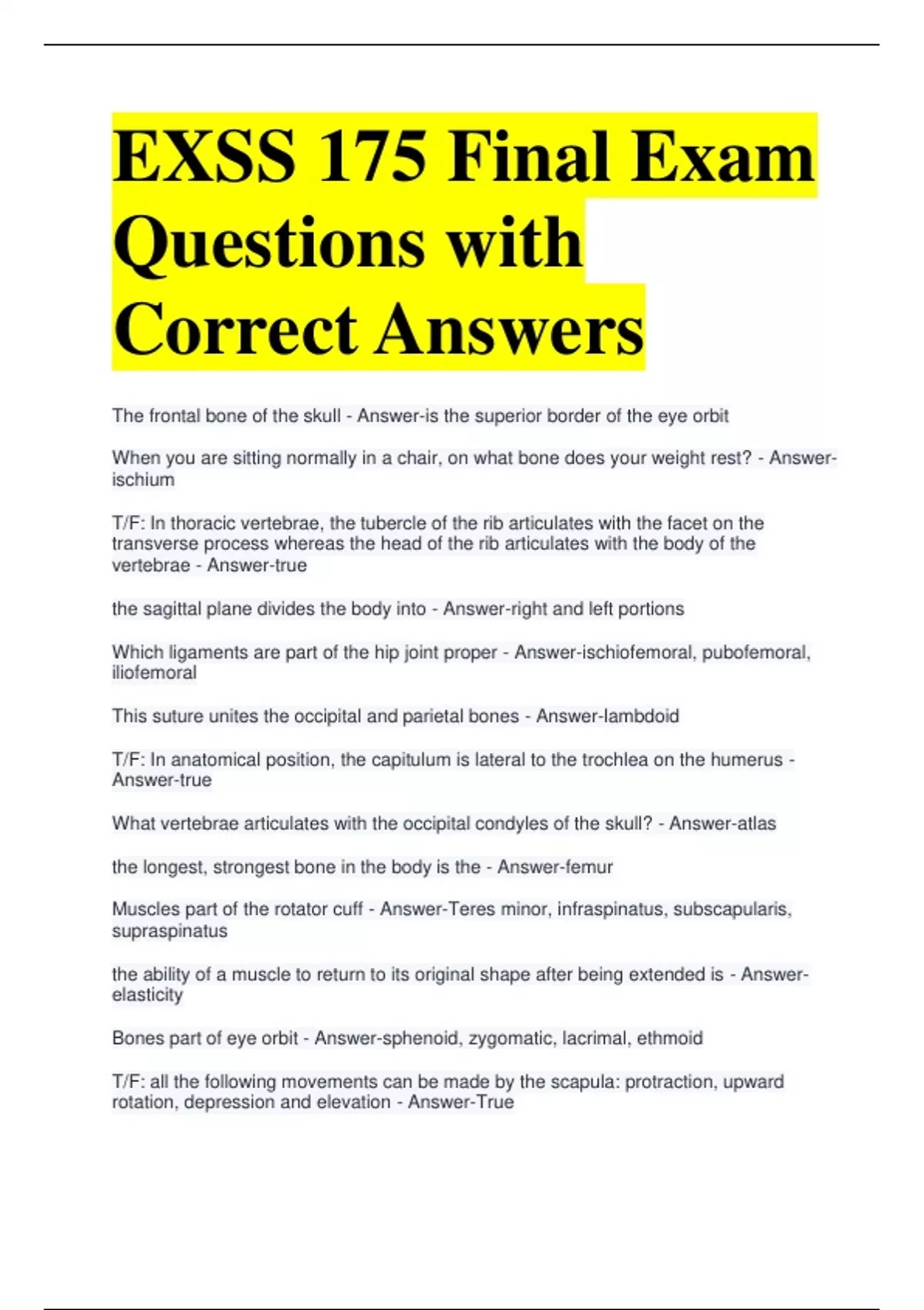 EXSS 175 Final Exam Questions with Correct Answers The frontal bone of the skull - Answer-is the superior border of the eye orbit When you are sitting normally in a chair, on what bone does your weight rest? - Answer- ischium T/F: In thoracic vertebrae, the tubercle of the rib articulates with the facet on the transverse process whereas the head of the rib articulates with the body of the vertebrae - Answer-true the sagittal plane divides the body into - Answer-right and left portions Which ligaments are part of the hip joint proper - Answer-ischiofemoral, pubofemoral, iliofemoral This suture unites the occipital and parietal bones - Answer-lambdoid T/F: In anatomical position, the capitulum is lateral to the trochlea on the humerus - Answer-true What vertebrae articulates with the occipital condyles of the skull? - Answer-atlas the longest, strongest bone in the body is the - Answer-femur Muscles part of the rotator cuff - Answer-Teres minor, infraspinatus, subscapularis, supraspinatus the ability of a muscle to return to its original shape after being extended is - Answer- elasticity Bones part of eye orbit - Answer-sphenoid, zygomatic, lacrimal, ethmoid T/F: all the following movements can be made by the scapula: protraction, upward rotation, depression and elevation - Answer-True The ligament providing stability to the medial side of the talocrural joint is the - Answer- deltoid Another name for the medial collateral ligament in the knee is the - Answer-tibial collateral ligament T/F movement in the transverse plane takes place in the longitudinal axis - Answer-true During contraction of skeletal muscle, - Answer-the z-discs are pulled toward the m-line The is in the middle of the sarcomere and acts as a point of attachment for myosin - Answer-M-line The medial longitudinal arch contains the 1st metatarsal, 1st cuneiform and: - Answer- navicular and calcaneus The pituitary gland is just inferior to the - Answer-hypothalamus Which lobe of the pituitary is larger and more inferior - Answer-anterior The thumb is an example of a joint - Answer-saddle The wearing away of articular cartilage in a synovial joint is called - Answer- osteoarthritis T/F: When the carpals are in anatomical position, the scaphoid is lateral to the lunate bone. - Answer-true Which of the following describes an exaggeration of the normal lumbar curve in the sagittal plane - Answer-lordosis Name the action of the Sternocleidomastoid - Answer-flex cervical portion of the vertebral column Name the action of the Internal intercostals: - Answer-draws the adjacent ribs together during forced exhalation Name the action of the Platysma: - Answer-depresses the mandible Name the action of the Transverse Abdominus: - Answer-compress the abdomen Name the action of the multifidis - Answer-extend the vertebral column The origin of the brachialis is the - Answer-distal, anterior surface of the humerus The origin of the levator scapulae is the - Answer-transverse processes of C1-C4 The origin of the rhomboid minor is the - Answer-spines of C7-T1 The origin of the teres minor is the - Answer-inferior lateral border of the scapula A nerve impulse is traveling from one neuron (A) to another neuron (B). What part of neuron (B) will receive the impulse first - Answer-dendrite If someone's myelin is deteriorating, what will happen to his or her nerve impulses - Answer-the impulses will slow down Superficial to the grey matter of the brain, where does the cerebrospinal fluid circulate - Answer-subarachnoid space Moving from the skull to the brain, what is the correct order of the brain meninges and spaces - Answer-dura mater, subdural space, arachnoid mater, pia mater What brain structure compares planned movement with actual movement - Answer- cerebellum what brain structure is closest to the spinal cord - Answer-medulla oblongata If someone was having a problem with reactivity to light during a cranial nerve examination, which nerve would you suspect is injured - Answer-oculomotor Which cranial nerve allows for the ability to smell food - Answer-olfactory action of interossei palmaris - Answer-adduction of the fingers action of abductor pollicis brevis - Answer-abduction of the thumb action of extensor digitorum - Answer-extension of the wrist action of flexor carpi radialis - Answer-flexion of the wrist action of pronator teres - Answer-pronation of the forearm
