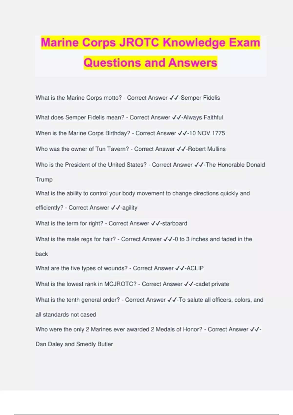 Marine Corps JROTC Knowledge Exam Questions and Answers What is the Marine Corps motto? - Correct Answer ️️ -Semper Fidelis What does Semper Fidelis mean? - Correct Answer ️️ -Always Faithful When is the Marine Corps Birthday? - Correct Answer ️️ -10 NOV 1775 Who was the owner of Tun Tavern? - Correct Answer ️️ -Robert Mullins Who is the President of the United States? - Correct Answer ️️ -The Honorable Donald Trump What is the ability to control your body movement to change directions quickly and efficiently? - Correct Answer ️️ -agility What is the term for right? - Correct Answer ️️ -starboard What is the male regs for hair? - Correct Answer ️️ -0 to 3 inches and faded in the back What are the five types of wounds? - Correct Answer ️️ -ACLIP What is the lowest rank in MCJROTC? - Correct Answer ️️ -cadet private What is the tenth general order? - Correct Answer ️️ -To salute all officers, colors, and all standards not cased Who were the only 2 Marines ever awarded 2 Medals of Honor? - Correct Answer ️️ - Dan Daley and Smedly Butler How many leadership traits are there? - Correct Answer ️️ -14 Who is the sergeant major of the Marine Corps? - Correct Answer ️️ -Sergeant Major Green What is the second general order? - Correct Answer ️️ -To walk my post in a military manner, keeping always on the alert, and observing everything that takes p