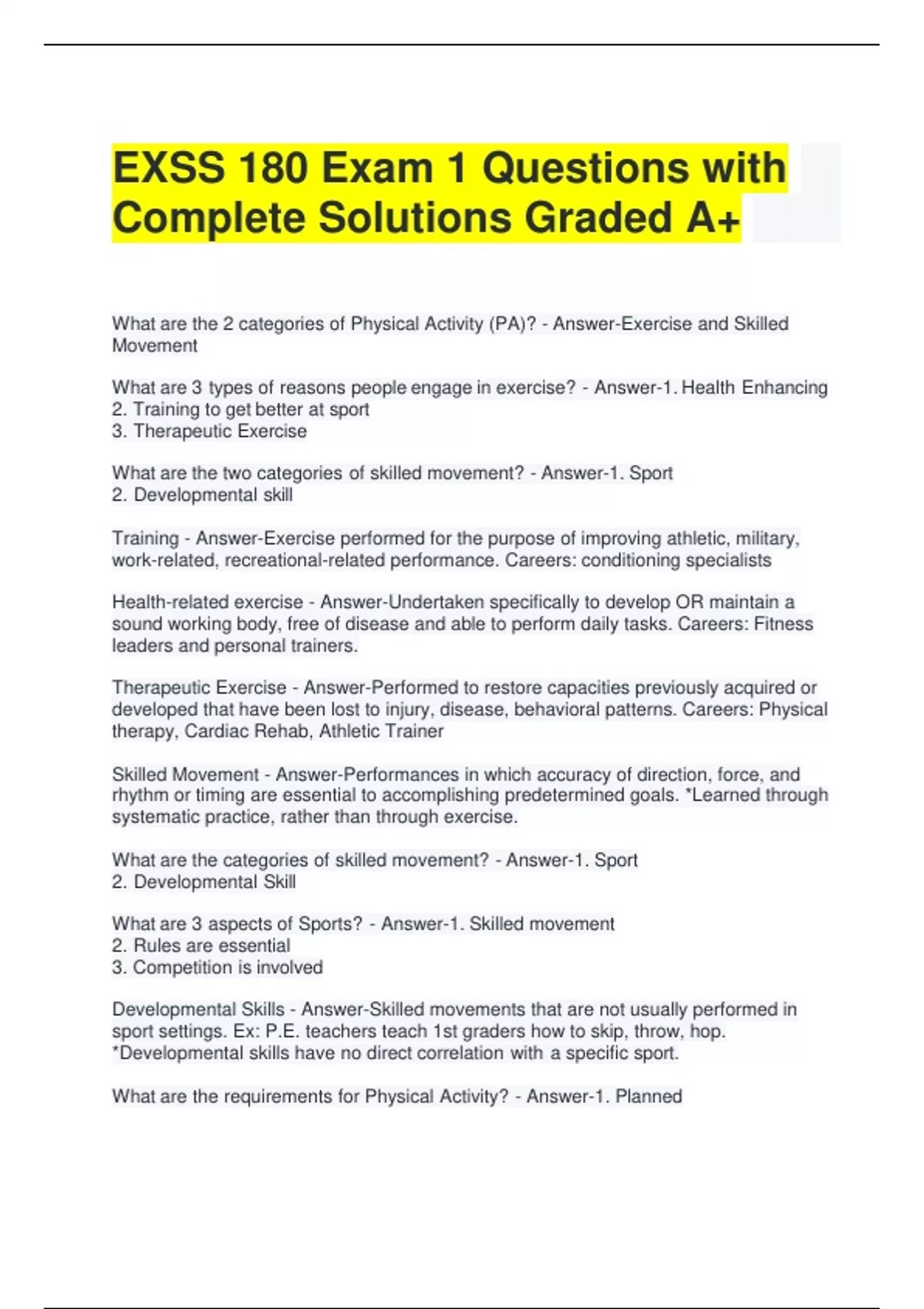 EXSS 180 Exam 1 Questions with Complete Solutions Graded A+ What are the 2 categories of Physical Activity (PA)? - Answer-Exercise and Skilled Movement What are 3 types of reasons people engage in exercise? - Answer-1. Health Enhancing 2. Training to get better at sport 3. Therapeutic Exercise What are the two categories of skilled movement? - Answer-1. Sport 2. Developmental skill Training - Answer-Exercise performed for the purpose of improving athletic, military, work-related, recreational-related performance. Careers: conditioning specialists Health-related exercise - Answer-Undertaken specifically to develop OR maintain a sound working body, free of disease and able to perform daily tasks. Careers: Fitness leaders and personal trainers. Therapeutic Exercise - Answer-Performed to restore capacities previously acquired or developed that have been lost to injury, disease, behavioral patterns. Careers: Physical therapy, Cardiac Rehab, Athletic Trainer Skilled Movement - Answer-Performances in which accuracy of direction, force, and rhythm or timing are essential to accomplishing predetermined goals. *Learned through systematic practice, rather than through exercise. What are the categories of skilled movement? - Answer-1. Sport 2. Developmental Skill What are 3 aspects of Sports? - Answer-1. Skilled movement 2. Rules are essential 3. Competition is involved Developmental Skills - Answer-Skilled movements that are not usually performed in sport settings. Ex: P.E. teachers teach 1st graders how to skip, throw, hop. *Developmental skills have no direct correlation with a specific sport. What are the requirements for Physical Activity? - Answer-1. Planned 2. Structured 3. Repetitive 4. Purposive Objectives of PA - Answer-1. To improve or maintain one or more components of PF 2. Health by-products Definition of Physical Activity (2008 PA Guidelines for Americans) - Answer-Any bodily movement produced by the contraction of skeletal muscle that increases energy expenditure above a basal level. Definition of Physical Activity (Be Active Your Way) - Answer-Any form of exercise or movement of the body that uses energy. Principle of overload - Answer-exposing the muscles, joints, and cardiovascular and respiratory systems to more work and stress than is normally experienced Progression - Answer-once a person reaches a certain fitness level, he or she progresses to higher levels of physical activity by continued overload and adaptation. Small, progressive changes in overload help the body adapt to the additional stresses while minimizing the risk of injury. Specificity - Answer-means that the benefits of physical activity are specific to the body systems that are doing the work. For example, aerobic physical activity largely benefits the body's cardiovascular system. Baseline activity (PAG) - Answer-(normal lifestyle activities) refers to the light-intensity activities of daily life, such as standing, walking slowly, and lifting lightweight objects. People vary in how much baseline activity they do. People who do only baseline activity are considered to be inactive. Health-enhancing physical activity (PAG) - Answer-is activity that, when added to baseline activity, produces health benefits. In this document, the term "physical activity" generally refers to health-enhancing physical activity. Brisk walking, jumping rope, dancing, lifting weights, climbing on playground equipment at recess, and doing yoga are all examples of physical activity. is the amount of energy expended per minute of activity. - Answer-absolute intensity is the level of effort required to do an activity - Answer- relative intensity scale of 1-10 The Physical Activity Guidelines are for Americans aged 6 and older (T/F) - Answer- True What are the 3 Most "Obese" Countries in the World? - Answer-1) USA 2) Mexico 3) New Zealand What are the 3 Most Preventable Causes of Death? (In Order) - Answer-1) Tobacco Use 2) Diet/Physical Activity 3) Alcohol Consumption Risk factors - Answer-Being in danger of getting whatever it is (ex. breast cancer running in the family) Risk behaviors - Answer-Things you do or do not do that could contribute to a bad health affect (ex. I'm at risk if I do not get a mammogram or have monthly breast exams) Children Adults Older Adults - Answer-6-17 18-64 65+ What counties are at the Top 25% for Diabetes, Obesity, Physical Inactivity? - Answer- 1) Southeastern U.S. 2) Parts of Northeastern U.S. Why are diabetes incidences predominantly in the S.E. US? - Answer-1) Diet of fried food & sweet tea 2) Limited access to fresh food & fitness centers, gyms (low SES) Explain the diabetes incidences in the northern/top of the map? - Answer-1) Native American reservations 2) High levels of diabetes and alcoholism Describe the trends in BMI categories in adults from . - Answer-The gap between healthy & overweight/obese groups is narrowing. What is the #1 barrier to exercise? - Answer-Lack of TIME What influences our physical activity/health? - Answer-1) Environmental 2) Societal/Cultural 3)Personal/Genetics 4) Policy Environmental influences of PA - Answer-Negative: Urbran sprawl Positive: Playgrounds, trails, greenways Video: How to Have a Heart Attack by Age 30 - Answer-1) Parents reinforced kid's behavior by allowing him to eat french fries + Mickey D's instead of veggies 2) Consistent poor eating habits over time 3) Lack of exercise 4) Inactivity or Passive Activity: Video games, TV True or False: BMI is reliable for individuals and populations. - Answer-FALSE. BMI is only reliable for populations, NOT individuals. What does "Like a Girl" Video talk about? - Answer-1) Challenges gender stereotypes that society dictates of what girls can/cannot do What does the Dove Ad talk about? - Answer-Unrealistic, distorted perceptions of beauty in society. Women see themselves as less beautiful than strangers see them, and the power of photoshop. Do diets work? - Answer-No, they don't work in the long-term. They're hard to follo