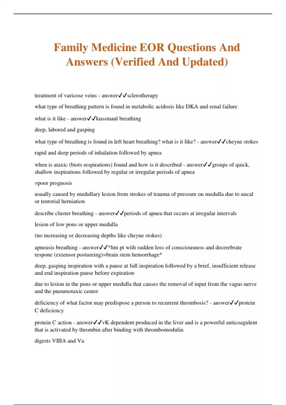 Family Medicine EOR Questions And Answers (Verified And Updated) treatment of varicose veins - answersclerotherapy what type of breathing pattern is found in metabolic acidosis like DKA and renal failure what is it like - answerkussmaul breathing deep, labored and gasping what type of breathing is found in left heart breathing? what is it like? - answercheyne stokes rapid and deep periods of inhalation followed by apnea when is ataxic (biots respirations) found and how is it described - answergroups of quick, shallow inspirations followed by regular or irregular periods of apnea =poor prognosis usually caused by medullary lesion from strokes of trauma of pressure on medulla due to uncal or tentorial herniation describe cluster breathing - answerperiods of apnea that occurs at irregular intervals lesion of low pons or upper medulla (no increasing or decreasing depths like cheyne stokes) apneusis breathing - answer*htn pt with sudden loss of consciousness and decerebrate respone (extensor postureing)=brain stem hemorrhage* deep, gasping inspiration with a pause at full inspiration followed by a brief, insufficient release and end inspiration pause before expiration due to lesion in the pons or upper medulla that causes the removal of input from the vagus nerve and the pneumotaxic center deficiency of what factor may predispose a person to recurrent thrombosis? - answerprotein C deficiency protein C action - answervK dependent produced in the liver and is a powerful anticoagulent that is activated by thrombin after binding with thrombomodulin digests VIIIA and Va protein S is a co factor for protein c and is produced by enothelial cells what does wide complex tachycardia consist of - answerventricular tachycardia and supraventricular tachycardia what does narrow complex tachycardia consist of - answersinus tach, a fib, a flutter, AV nodal reentry and atrical tachy what is the *INNITIAL* management for narrow complex tachycardia when *unstable* - answerimmediate synchronized cardioversion what is the *INNITIAL* management for narrow complex tachycardia when *stable* - answeradenosine 12mg IV and can be repeated twiced spaced 1-2 minutes apart how many joules should be used for cardioversion of atrial flutter - answer100 joules what should be considered in a patient with an anal fissure off the posterior midline - answercrohn, SCC, aids topical treatment of bacterial conjunctivitis - answersulfacetamide (10% 34x/day) what med used to treat bipolar disorder is a common cause of DI? - answerLithium can make the distal renal tubules resistant to the action of vasopressin what is the tx of pleuritis - answerNSAIDS (ibuprofen 400-800 mg 3x/day) diagnostic modality for PE - answerCTA ct angiography V/Q if pt cant have CT or the iv die or if it isnt available what are effective first line therapies for mild acne - answertopical retinoids: tretinoin, adapalene and tazarotene comedolytic: inhibits follicular canal obstruction by normaliazing keratinocyte shedding + antiinflammatory effects other topicals such as benzoyl peroxide, topical sulfacetamide and azelaic acid are also effective 1L for mild acne acne with a few papules and pustules without nodules (severity?) - answermild acne comedones, several papule and pustules and a few nodules is what level of severity of acne - answermoderate numerous comedones, papules, pustules and nodules - answersevere acne
