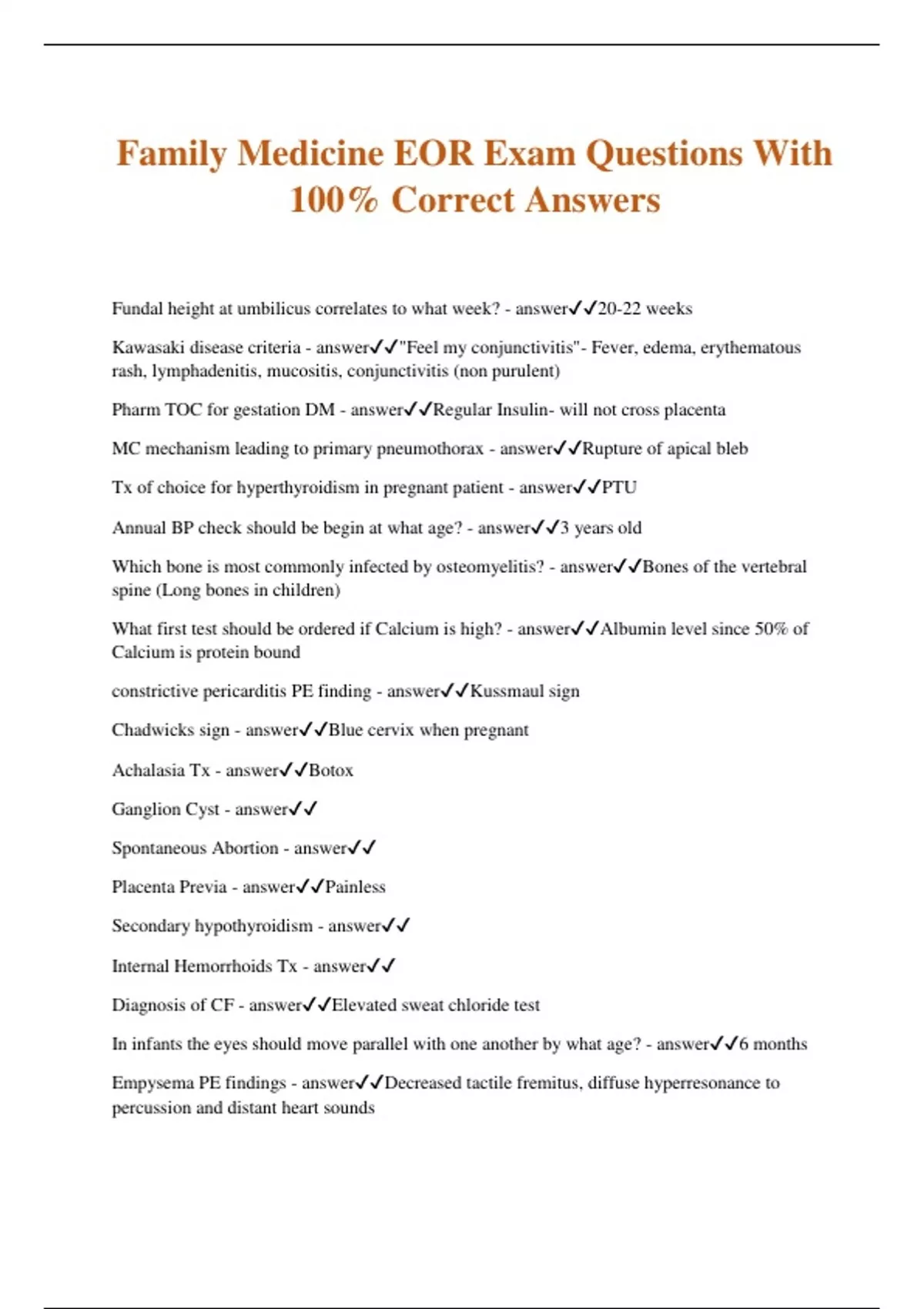 Family Medicine EOR Exam Questions With 100% Correct Answers Fundal height at umbilicus correlates to what week? - answer20-22 weeks Kawasaki disease criteria - answer"Feel my conjunctivitis"- Fever, edema, erythematous rash, lymphadenitis, mucositis, conjunctivitis (non purulent) Pharm TOC for gestation DM - answerRegular Insulin- will not cross placenta MC mechanism leading to primary pneumothorax - answerRupture of apical bleb Tx of choice for hyperthyroidism in pregnant patient - answerPTU Annual BP check should be begin at what age? - answer3 years old Which bone is most commonly infected by osteomyelitis? - answerBones of the vertebral spine (Long bones in children) What first test should be ordered if Calcium is high? - answerAlbumin level since 50% of Calcium is protein bound constrictive pericarditis PE finding - answerKussmaul sign Chadwicks sign - answerBlue cervix when pregnant Achalasia Tx - answerBotox Ganglion Cyst - answer Spontaneous Abortion - answer Placenta Previa - answerPainless Secondary hypothyroidism - answer Internal Hemorrhoids Tx - answer Diagnosis of CF - answerElevated sweat chloride test In infants the eyes should move parallel with one another by what age? - answer6 months Empysema PE findings - answerDecreased tactile fremitus, diffuse hyperresonance to percussion and distant heart sounds Indications for Chronic pancreatitis treatment - answerSevere pain that limits the patient's functioning or intractable pain despite the use of non-narcotic analgesics and absence of alcohol intake. Acute pericarditis treatment - answerIndomethacin or other NSAID What tissue and hormonal phase are present in the last 14 days of cycle - answerSecretory luteal phase under influence of estrogen and progesterone Salmon patch - answerlight red macule over the nape of the neck or the glabella Hallmark sign of EBV on smear - answerpresence of lymphocytosis with atypical large lymphocytes seen in the blood smear. Best test to help manage patient that having seizures and hallucinations and says he has done "drugs" - answerSerum creatinine kinase is the most sensitive test to detect rhabdomyolysis, a serious complication of seizures and hyperthermia related to drug abuse. TOC in chronic gout - answerbest drug to lower rate acid. It is xanthine oxidase inhibitor-- lowers rates of gout Colchine use - answerUsed in patients with topic gout and is used in the acute phase of gout When does Moro reflex start to disappear - answer5-6 months of age When does grasp reflex start to disappear - answer2-3 months of age When does the tonic neck reflex start to disappear? - answer6-7 months of age First line drug therapy for schizophrenia - answerAtypical anti psych: olanzapine, risperidone, quetiapine, ziprasidone, and clozapine Galazzei fracture - answerAlong the length of the radius with damage to the distal radioulnar joint Colles fracture - answerFracture of the distal radius with dorsal displacement of the radial head Smith fracture - answerFracture of the distal radius with ventral displacement of the radial head Aortic stenosis murmur - answerStraining decreases the intensity of the murmur associated with aortic stenosis and squatting increases the intensity. Use of systemic corticosteroids can cause what eye condition? - answerGlaucoma For a pregnant mother who's has not been vaccinated for rubella, when should she receive the vaccine? - answerThe proper time to receive the vaccine is after delivery of the infant. What is the best initial screening test for SLE? - answerANA Confirmation labs for SLE - answeranti-smith and dsDNA Positive kernig's sign - answerpain is noted on straightening the knee after flexing both the hip and knee. Vulvular squamos cell hyperplasia presentation - answerThickening and hyperkeratosis of the vulva. The lesions are red and moist and cause intense pruritus over time the area becomes thickened and a white plaque may develop. Biopsy must be done to evaluate for intraepithelial neoplasm or invasive tumor. MCC of serious bleeding in pregnancy - answerPlacenta abruptio- painful uterine bleeding Addison disease s/sx - answeranorexia, weight loss, fatigue, GI symptoms, salt craving, hyper pigmentation, hypotension Addison disease dx - answer1. corticotropin stimulation test (Cosyntropin)--> low cortisol and high ACTH. 2. Labs: hypnoatremia, hyperkalemia, hypoglycemia, hypercalcemia (?) CURB 65 - answerConfusion, Uremia (BUn >19), RR> 30, BP <90 or <60, >65 or 65 Criteria for pleural effusion - answerLight's criteria--> fluid is exudative if one of the following is present--> Effusion protein/serum protein ratio greater than 0.5 Effusion lactate dehydrogenase (LDH)/serum LDH ratio greater than 0.6 Effusion LDH level greater than two-thirds the upper limit of the laboratory's reference range of serum LDH Exudative causes of PE - answerTB, malignancy, pulmonary embolism Transudative causes of PE - answerCirrhosis, CHF, nephrotic syndrome Thiazide diuretic ADR - answerhypokalemia, hyponatremia, hyperuricemia, hyperglycemia The finding of egophany is most consistent with? - answerLobar consolidation of PNA