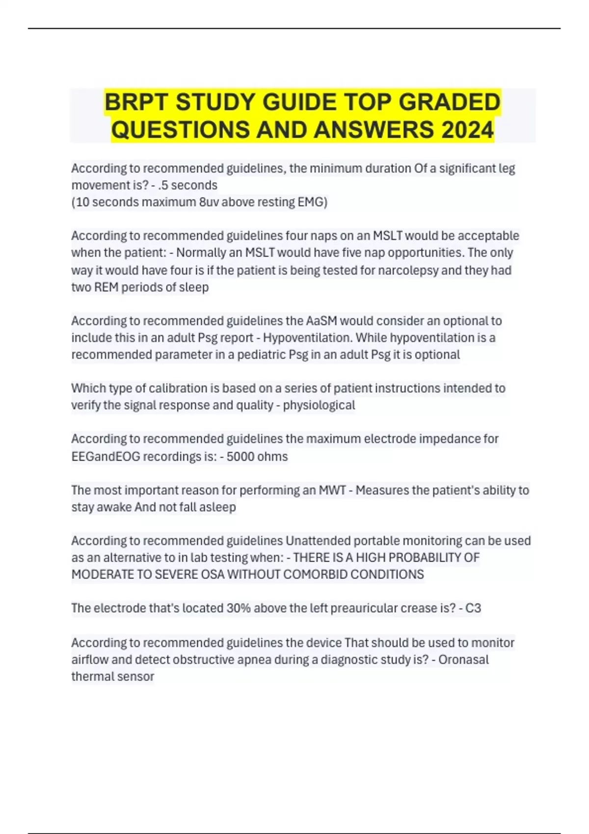 According to recommended guidelines, the minimum duration Of a significant leg movement is? - .5 seconds (10 seconds maximum 8uv above resting EMG) According to recommended guidelines four naps on an MSLT would be acceptable when the patient: - Normally an MSLT would have five nap opportunities. The only way it would have four is if the patient is being tested for narcolepsy and they had two REM periods of sleep According to recommended guidelines the AaSM would consider an optional to include this in an adult Psg report - Hypoventilation. While hypoventilation is a recommended parameter in a pediatric Psg in an adult Psg it is optional Which type of calibration is based on a series of patient instructions intended to verify the signal response and quality - physiological According to recommended guidelines the maximum electrode impedance for EEGandEOG recordings is: - 5000 ohms The most important reason for performing an MWT - Measures the patient's ability to stay awake And not fall asleep According to recommended guidelines Unattended portable monitoring can be used as an alternative to in lab testing when: - THERE IS A HIGH PROBABILITY OF MODERATE TO SEVERE OSA WITHOUT COMORBID CONDITIONS The electrode that's located 30% above the left preauricular crease is? - C3 According to recommended guidelines the device That should be used to monitor airflow and detect obstructive apnea during a diagnostic study is? - Oronasal thermal sensor