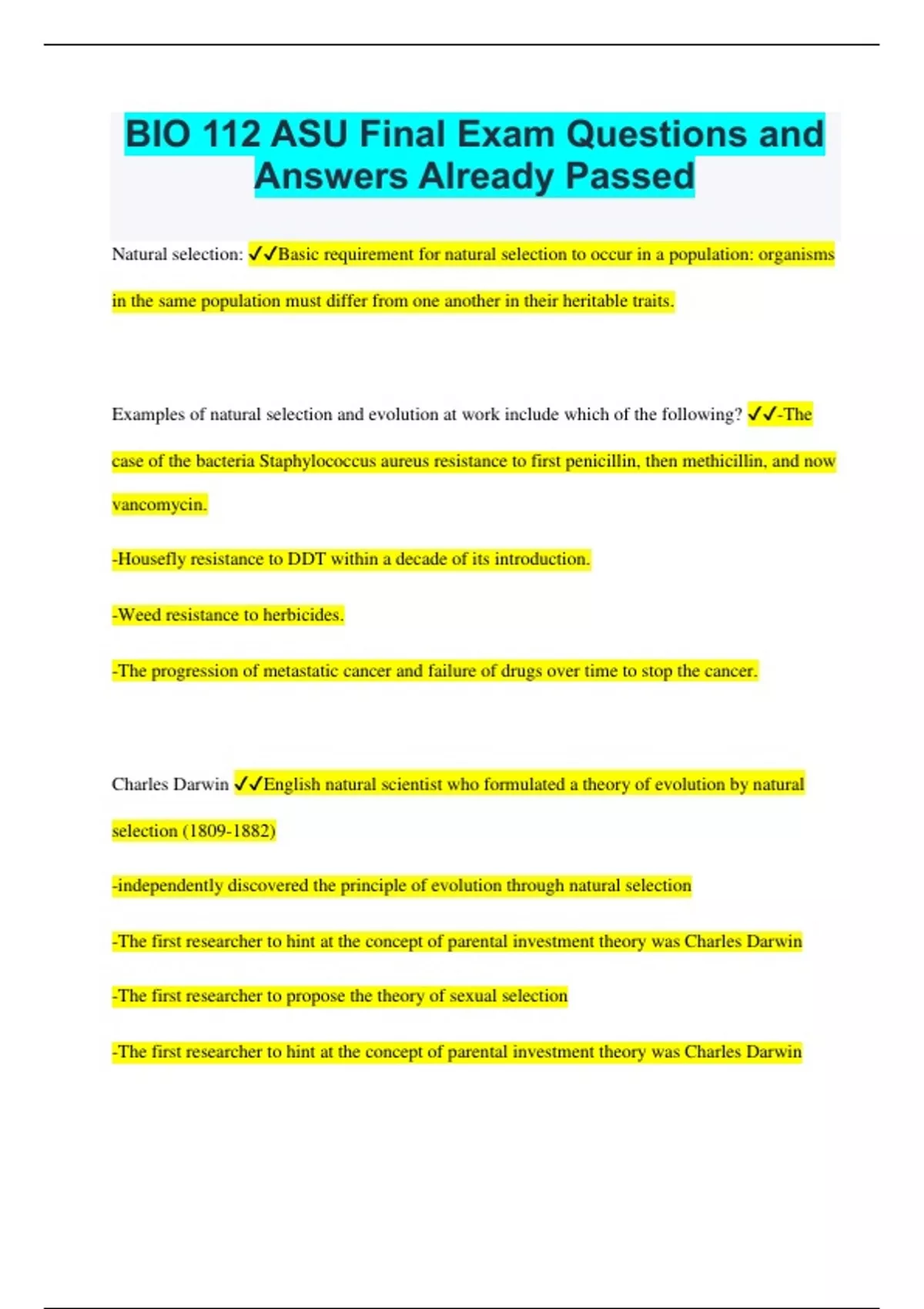 BIO 112 ASU Final Exam Questions and Answers Already Passed