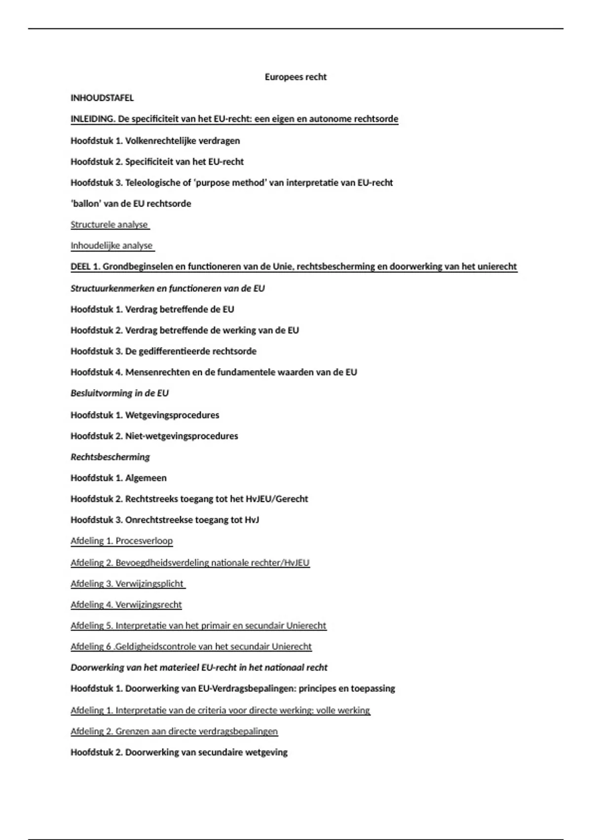 Het bevat de structuur van de cursus met aanvullingen uit de les. In tegenstelling tot hoe de lessen verliepen (chaotisch met iedere les een verandering van onderwerp, waardoor de structuur moeilijk te snappen was) is deze samenvatting gestructureerd. Perfect om bij je te hebben als basis voor het openboek-examen. De conclusies van arresten staan erin, maar het leesdossier zal je toch zelf moeten lezen. Dit is om de details aan te vullen en het zelf beter te snappen. Dit zal uiteraard ook lukken met deze samenvatting.