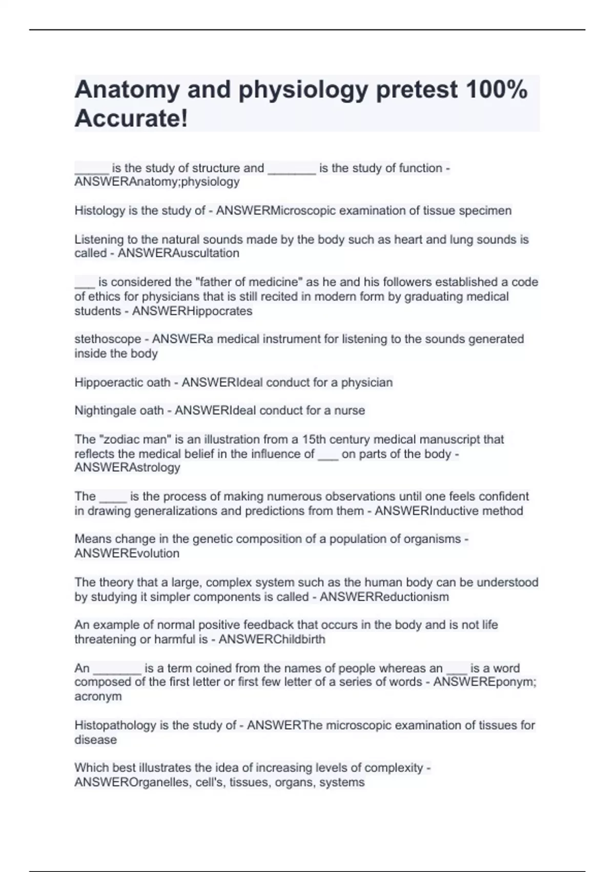 _____ is the study of structure and _______ is the study of function - ANSWERAnatomy;physiology Histology is the study of - ANSWERMicroscopic examination of tissue specimen Listening to the natural sounds made by the body such as heart and lung sounds is called - ANSWERAuscultation ___ is considered the "father of medicine" as he and his followers established a code of ethics for physicians that is still recited in modern form by graduating medical students - ANSWERHippocrates stethoscope - ANSWERa medical instrument for listening to the sounds generated inside the body Hippoeractic oath - ANSWERIdeal conduct for a physician Nightingale oath - ANSWERIdeal conduct for a nurse The "zodiac man" is an illustration from a 15th century medical manuscript that reflects the medical belief in the influence of ___ on parts of the body - ANSWERAstrology The ____ is the process of making numerous observations until one feels confident in drawing generalizations and predictions from them - ANSWERInductive method Means change in the genetic composition of a population of organisms - ANSWEREvolution