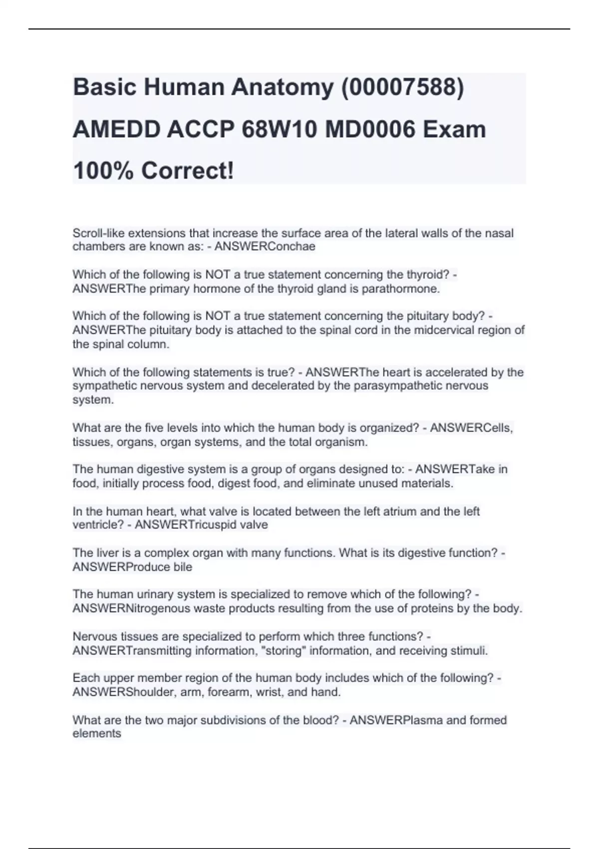 Basic Human Anatomy () AMEDD ACCP 68W10 MD0006 Exam 100% Correct!