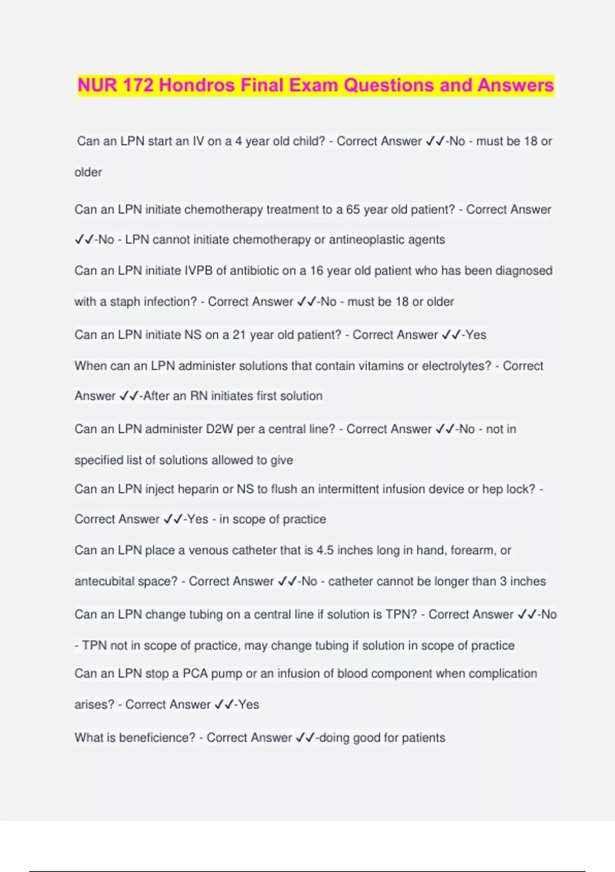 NUR 172 Hondros Final Exam Questions and Answers Can an LPN start an IV on a 4 year old child? - Correct Answer ️️ -No - must be 18 or older Can an LPN initiate chemotherapy treatment to a 65 year old patient? - Correct Answer ️️ -No - LPN cannot initiate chemotherapy or antineoplastic agents Can an LPN initiate IVPB of antibiotic on a 16 year old patient who has been diagnosed with a staph infection? - Correct Answer ️️ -No - must be 18 or older Can an LPN initiate NS on a 21 year old patient? - Correct Answer ️️ -Yes When can an LPN administer solutions that contain vitamins or electrolytes? - Correct Answer ️️ -After an RN initiates first solution Can an LPN administer D2W per a central line? - Correct Answer ️️ -No - not in specified list of solutions allowed to give Can an LPN inject heparin or NS to flush an intermittent infusion device or hep lock? - Correct Answer ️️ -Yes - in scope of practice Can an LPN place a venous catheter that is 4.5 inches long in hand, forearm, or antecubital space? - Correct Answer ️️ -No - catheter cannot be longer than 3 inches Can an LPN change tubing on a central line if solution is TPN? - Correct Answer ️️ -No - TPN not in scope of practice, may change tubing if solution in scope of practice Can an LPN stop a PCA pump or an infusion of blood component when complication arises? - Correct Answer ️️ -Yes What is beneficience? - Correct Answer ️️ -doing good for patients What is veracity? - Correct Answer ️️ -truthfulness What is justice? - Correct Answer ️️ -obligation to be fair to all people What is nonmaleficence? - Correct Answer ️️ -doing no harm to patients What is fidelity? - Correct Answer ️️ -obligation to be faithful What is autonomy? - Correct Answer ️️ -right to self-determination; independence What is a peripheral nerve catheter? - Correct Answer ️️ -A form a pain relief at surgery site; small plastic catheter placed under the skin where nerves provide feeling to the area where surgery will be performed What would you teach your patient about the peripheral nerve catheter? - Correct Answer ️️ -Can remove bandages and catheter after return of sensation (12 hours), must keep dressing over catheter clean and dry, avoid hot/cold objects and keep extremity close to body, s/s of infection If the patient notices the dressing of the peripheral nerve catheter coming off before sensation returns, what should you instruct them to do? - Correct Answer ️️ -Reinforce with tape, DO NOT remove the dressing True or False: the patient should not take a shower or tub bath while the catheter is in place. - Correct Answer ️️ -True - patient should do a sponge bath instead What are the goals of IV therapy? - Correct Answer ️️ -Maintenance, replacement, restoration of homeostasis Maintenance therapy - Correct Answer ️️ -provides nutrients that meet the daily needs of a patient for water, electrolytes, and dextrose Replacement therapy - Correct Answer ️️ -necessary to take care of fluid, electrolyte, or blood product deficits of patients in acute distress Restoration - Correct Answer ️️ -when maintenance and replacement therapy don't meet the needs of the patient, fluid and electrolyte management is accomplished through this What is the preferred antiseptic agent recommended by INS? - Correct Answer ️️ - Chlorhexidine How long should the needless connector be scrubbed for? - Correct Answer ️️ -15 seconds Why is the saline lock (formerly: hep-lock) primed before it is attached