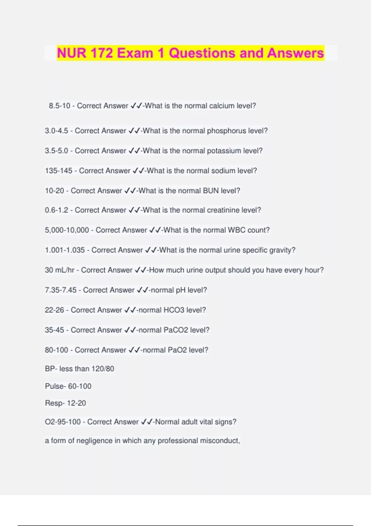 NUR 172 Exam 1 Questions and Answers 8.5-10 - Correct Answer ️️ -What is the normal calcium level? 3.0-4.5 - Correct Answer ️️ -What is the normal phosphorus level? 3.5-5.0 - Correct Answer ️️ -What is the normal potassium level? 135-145 - Correct Answer ️️ -What is the normal sodium level? 10-20 - Correct Answer ️️ -What is the normal BUN level? 0.6-1.2 - Correct Answer ️️ -What is the normal creatinine level? 5,000-10,000 - Correct Answer ️️ -What is the normal WBC count? 1.001-1.035 - Correct Answer ️️ -What is the normal urine specific gravity? 30 mL/hr - Correct Answer ️️ -How much urine output should you have every hour? 7.35-7.45 - Correct Answer ️️ -normal pH level? 22-26 - Correct Answer ️️ -normal HCO3 level? 35-45 - Correct Answer ️️ -normal PaCO2 level? 80-100 - Correct Answer ️️ -normal PaO2 level? BP- less than 120/80 Pulse- 60-100 Resp- 12-20 O2-95-100 - Correct Answer ️️ -Normal adult vital signs? a form of negligence in which any professional misconduct, unreasonable lack of professional skill, or nonadherence to the accepted standard of care causes injury to patient - Correct Answer ️️ -What is malpractice? breach of duty without injury Not checking what needs to be done on time or when it was supposed to be done. (lazy) - Correct Answer ️️ -What is negligence? Duty Breach of duty Injury (such as a vesicant) Causation- - breach of duty caused injury - Correct Answer ️️ -What are malpractice's 4 standards? to do good (for our pt) - Correct Answer ️️ -What is beneficence? to tell the truth - Correct Answer ️️ -Veracity means? right to self determination- independence - Correct Answer ️️ -Autonomy means? being fair to all people - Correct Answer ️️ -Justice means? being faithful - Correct Answer ️️ -Fidelity means? to do no harm - Correct Answer ️️ -Nonmaleficence means? Fluid has no major shift, fluid stays in intracellular space, no major change in BP - Correct Answer ️️ -Isotonic s