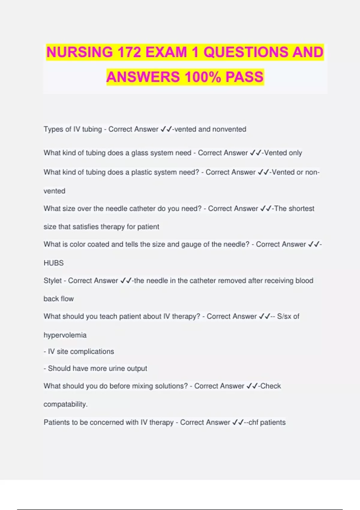 NURSING 172 EXAM 1 QUESTIONS AND ANSWERS 100% PASS Types of IV tubing - Correct Answer ️️ -vented and nonvented What kind of tubing does a glass system need - Correct Answer ️️ -Vented only What kind of tubing does a plastic system need? - Correct Answer ️️ -Vented or non- vented What size over the needle catheter do you need? - Correct Answer ️️ -The shortest size that satisfies therapy for patient What is color coated and tells the size and gauge of the needle? - Correct Answer ️️ - HUBS Stylet - Correct Answer ️️ -the needle in the catheter removed after receiving blood back flow What should you teach patient about IV therapy? - Correct Answer ️️ -- S/sx of hypervolemia - IV site complications - Should have more urine output What should you do before mixing solutions? - Correct Answer ️️ -Check compatability. Patients to be concerned with IV therapy - Correct Answer ️️ --chf patients - elderly -renal patients Where do you find drop factor? - Correct Answer ️️ -On the bag for tubing What is normal saline used for? - Correct Answer ️️ -trauma, blood loss and blood transfusion How many gtts does a micro-drip needle drop? - Correct Answer ️️ -60 gtts How long is a piggyback tubing? - Correct Answer ️️ -30-36 inches What ate goals for parental therapy? - Correct Answer ️️ -1. Maintainence 2. Replacing 3. Restoring Tanners model of clinical judgement - Correct Answer ️️ -1. Notice 2. Interpret 3. Respond 4. Reflect Four elements needed to prove malpractice. - Correct Answer ️️ -1. DUTY 2. BREACH DUTY 3. INJURY 4. CAUSATION (to cause harm) Spiking and priming order - Correct Answer ️️ -1. Verify orders and allergies 2. Follow 6 medication rights 3. Perform 3 label checks (pulling from shelf, spiking and priming, before attatching.) 4. Check label for pt identity, solution expirtation. ct for contamination 6. Open iv tubing 7. Close roller slide/clamp 8. Remove plastic protector from tubing spike 9. Insert spike tubing in bag 10. Upright bag and place on iv pole 11. Squeeze chamber half full 12. Open clamp and allow fluid to run through 13. Inspect tubing for air bubbles and clear then. 14. Clean gloves attach to pt and regular order. 15. Remove gloves, wash hands patient education, document. What is IV piggy back for? - Correct Answer ️️ -1. Secondary tubing 2. Antibiotics 3. Pain meds What size iv catheter can an lpn insert? - Correct Answer ️️ -3 inches or less What shoukd you think when KCL - Correct Answer ️️ -Just potassium Standard of care - Correct Answer ️️ -Focuses on pt Standard of practice - Correct Answer ️️ -Focuses on provider How can lpn reduce risk of complications of iv therapy. - Correct Answer ️️ -1. 6 medication rights 2. Monitor for iv complications 3. Allergies 4. Evidence based practice. What is benefience? - Correct Answer ️️ -Doing good for p