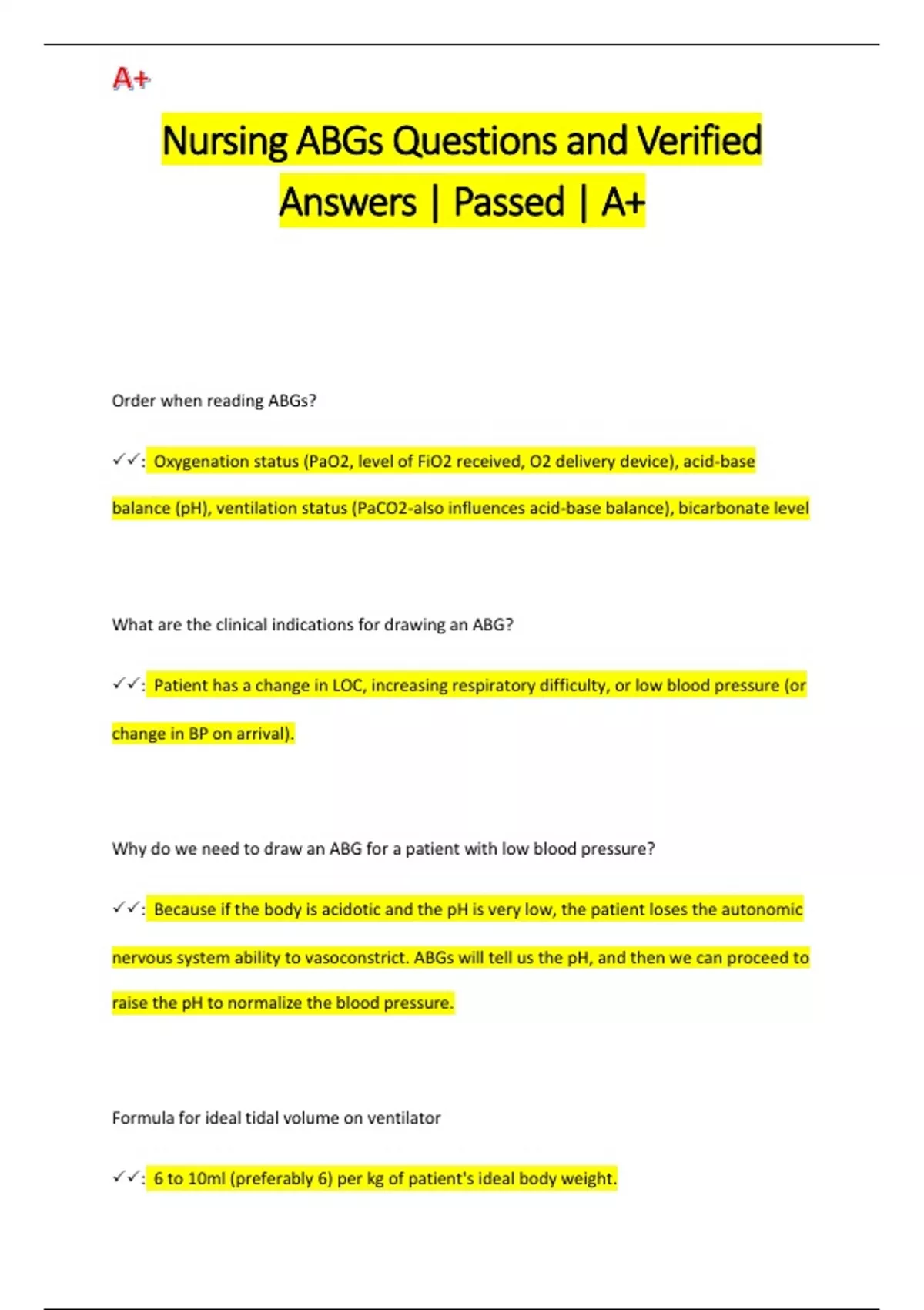 Nursing ABGs Questions and Verified Answers | Passed | A+