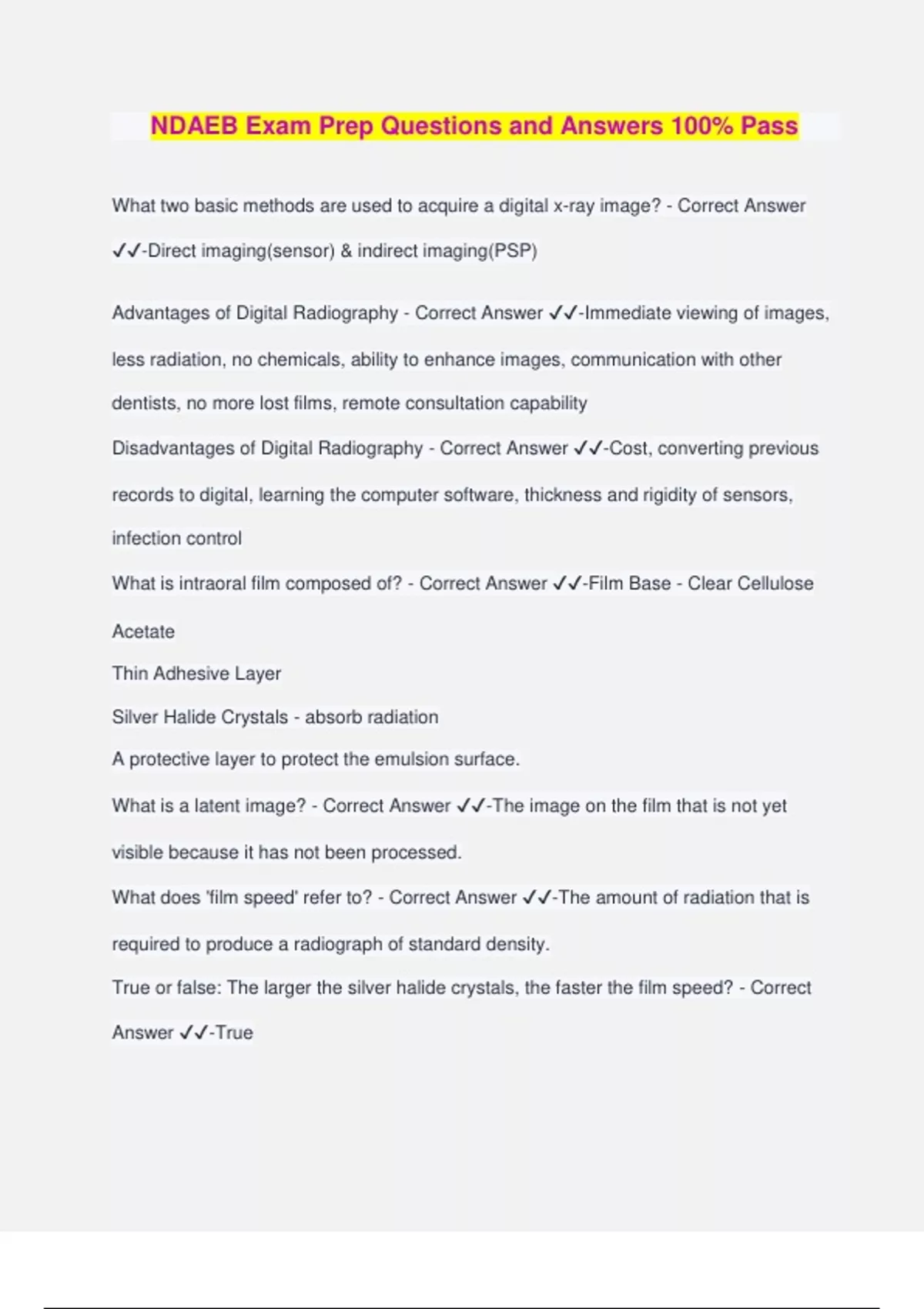 NDAEB Exam Prep Questions and Answers 100% Pass What two basic methods are used to acquire a digital x-ray image? - Correct Answer ️️ -Direct imaging(sensor) & indirect imaging(PSP) Advantages of Digital Radiography - Correct Answer ️️ -Immediate viewing of images, less radiation, no chemicals, ability to enhance images, communication with other dentists, no more lost films, remote consultation capability Disadvantages of Digital Radiography - Correct Answer ️️ -Cost, converting previous records to digital, learning the computer software, thickness and rigidity of sensors, infection control What is intraoral film composed of? - Correct Answer ️️ -Film Base - Clear Cellulose Acetate Thin Adhesive Layer Silver Halide Crystals - absorb radiation A protective layer to protect the emulsion surface. What is a latent image? - Correct Answer ️️ -The image on the film that is not yet visible because it has not been processed. What does 'film speed' refer to? - Correct Answer ️️ -The amount of radiation that is required to produce a radiograph of standard density. True or false: The larger the silver halide crystals, the faster the film speed? - Correct Answer ️️ -True What is the fastest film speed currently available? - Correct Answer ️️ -F-Speed. (It reduces patient exposure to radiation by 20-60% compared to E or D speed film) What are the 3 types of x-ray film used in dental radiography? - Correct Answer ️️ - Intraoral film, extraoral film, and duplicating film. When does a "Herringbone" pattern occur on dental film? - Correct Answer ️️ -When it is placed in the mouth backwards. What are the 5 basic sizes that intraoral film comes in? - Correct Answer ️️ -Child Size: 0 Narrow Anterior: 1 Adult Size: 2 Preformed bitewing: 3 (infrequently used) Occlusal: 4 What are two common extraoral radiographs taken? - Correct Answer ️️ -Panoramic and Cephalometric. What is an intensifying screen? - Correct Answer ️️ -A device that intensifies or increases the effect of radiation and thus decreases the amount of exposure time needed. It is coated with phosphor which gives off light when struck by x-radiation. What are the 5 steps in processing film? - Correct Answer ️️ -1. Developing (reduce the silver halide crystals into black metallic silver) 2. Rinsing (remove developer from film) 3. Fixing. (use an acidic solution to remove unexposed silver halide crystals) 4. Washing (wash the film) 5. Drying What are the two techniques that can be used for exposing intraloral images? - Correct Answer ️️ -Bisecting & Paralleling 5 Basic Rules of the Paralleling Technique - Correct Answer ️️ -1. Placement: it must cover correct teeth to be examined 2. Position: it must be parallel to the long axis of the tooth. 3. Vertical Angulation: Central ray must be directed perpendicular to the receptor & tooth. 4. Horizontal Angulation: Central ray must be directed throug