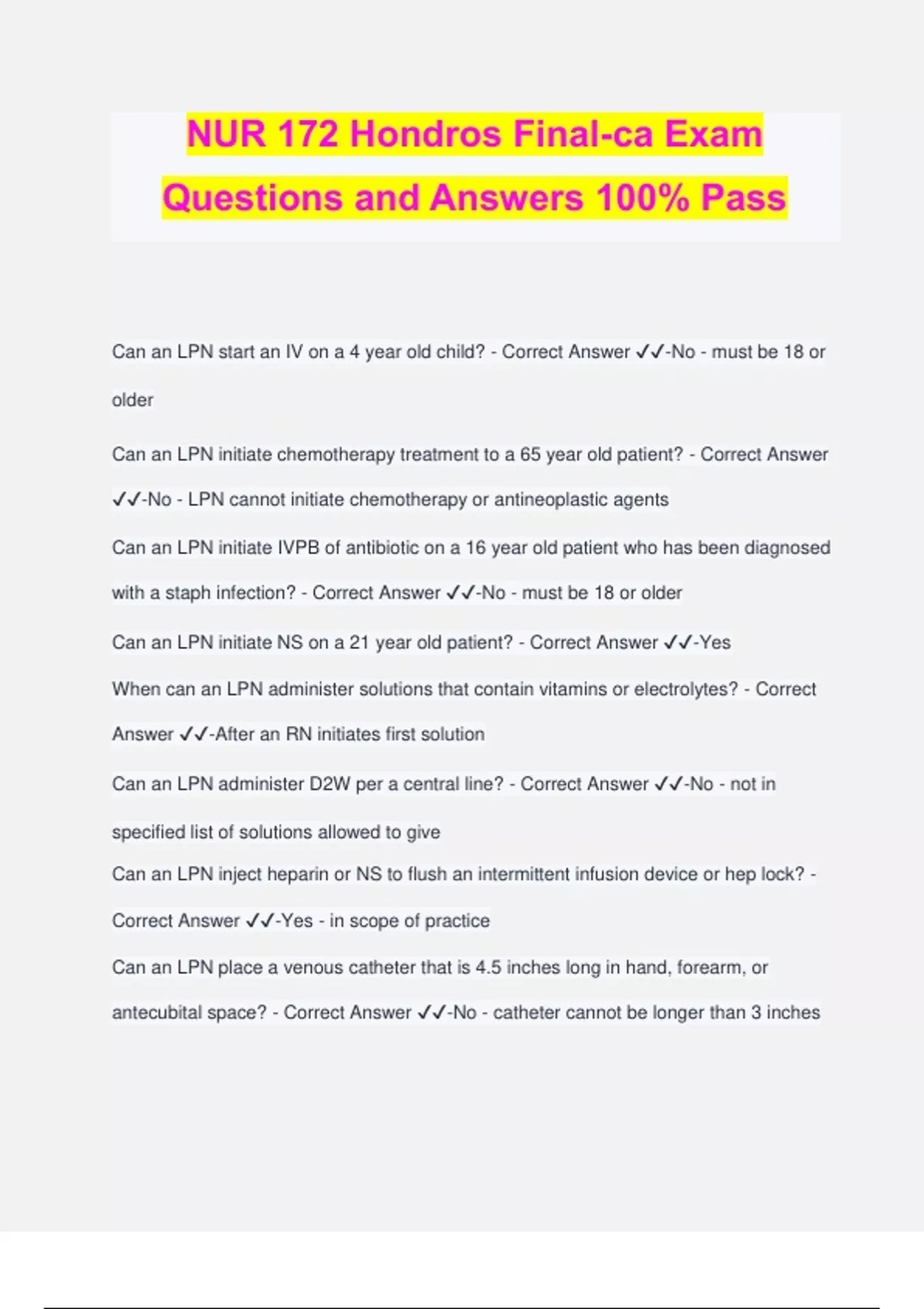 NUR 172 Hondros Final-ca Exam Questions and Answers 100% Pass Can an LPN start an IV on a 4 year old child? - Correct Answer ️️ -No - must be 18 or older Can an LPN initiate chemotherapy treatment to a 65 year old patient? - Correct Answer ️️ -No - LPN cannot initiate chemotherapy or antineoplastic agents Can an LPN initiate IVPB of antibiotic on a 16 year old patient who has been diagnosed with a staph infection? - Correct Answer ️️ -No - must be 18 or older Can an LPN initiate NS on a 21 year old patient? - Correct Answer ️️ -Yes When can an LPN administer solutions that contain vitamins or electrolytes? - Correct Answer ️️ -After an RN initiates first solution Can an LPN administer D2W per a central line? - Correct Answer ️️ -No - not in specified list of solutions allowed to give Can an LPN inject heparin or NS to flush an intermittent infusion device or hep lock? - Correct Answer ️️ -Yes - in scope of practice Can an LPN place a venous catheter that is 4.5 inches long in hand, forearm, or antecubital space? - Correct Answer ️️ -No - catheter cannot be longer than 3 inches Can an LPN change tubing on a central line if solution is TPN? - Correct Answer ️️ -No - TPN not in scope of practice, may change tubing if solution in scope of practice Can an LPN stop a PCA pump or an infusion of blood component when complication arises? - Correct Answer ️️ -Yes What is beneficience? - Correct Answer ️️ -doing good for patients What is veracity? - Correct Answer ️️ -truthfulness What is justice? - Correct Answer ️️ -obligation to be fair to all people What is nonmaleficence? - Correct Answer ️️ -doing no harm to patients What is fidelity? - Correct Answer ️️ -obligation to be faithful What is autonomy? - Correct Answer ️️ -right to self-determination; independence What is a peripheral nerve catheter? - Correct Answer ️️ -A form a pain relief at surgery site; small plastic catheter placed under the skin where nerves provide feeling to the area where surgery will be performed What would you teach your patient about the peripheral nerve catheter? - Correct Answer ️️ -Can remove bandages and catheter after return of sensation (12 hours), must keep dressing over catheter clean and dry, avoid hot/cold objects and keep extremity close to body, s/s of infection If the patient notices the dressing of the peripheral nerve catheter coming off before sensation returns, what should you instruct them to do? - Correct Answer ️️ -Reinforce with tape, DO NOT remove the dressing True or False: the patient should not take a shower or tub bath while the catheter is in place. - Correct Answer ️️ -True - patient should do a sponge bath instead What are the goals of IV therapy? - Correct Answer ️️ -Maintenance, replacement, restoration of homeostasis Maintenance therapy - Correct Answer ️️ -provides nutrients that meet the daily needs of a patient for water, electrolytes, and dextrose Replacement therapy - Correct Answer ️️ -necessary to take care of fluid, electrolyte, or blood product deficits of patients in acute distress Restoration - Correct Answer ️️ -when maintenance and replacement therapy don't meet the needs of the patient, fluid and electrolyte management is accomplished through this What is the preferred antiseptic agent recommended by INS? - Correct Answer ️️ - Chlorhexidine How long should the needless connector be scrubbed for? - Correct Answer ️️ -15 seconds Why is the saline lock (formerly: hep-lock) primed before it is attached to the hub of the catheter during IV insertion? - Correct Answer ️️ -to avoid air embolism What is hematoma? - Correct Answer ️️ -Infiltration of blood into tissues at ventipuncture site S/S of hematoma - Correct Answer ️️ -discoloration of skin, swelling and discomfort, inability to advance cannula into vein, resistance to pressure during flushing Prevention of hematoma - Correct Answer ️️ -use indirect method for starting a PIV Treatment of hematoma - Correct Answer ️️ -removal of catheter, direct pressure on site with gauze, elevate extremity, apply ice to affected area What is thrombosis? - Correct Answer ️️ -catheter related obstruction S/S of thrombosis - Correct Answer ️️ -fever, malaise, slowed or stopped infusion rate, inability to flush catheter Treatment for thrombosis - Correct Answer ️️ -Remove IV, notify MD - NEVER flush cannula to remove occlusion What is inflitration? - Correct Answer ️️ -Inadvertent administration of nonvesicant solution to surrounding tissues S/S of infiltration - Correct Answer ️️ -swollen, cool, taut, pale skin Interventions for infiltration - Correct Answer ️️ -stop infusion, remove IV catheter What is phlebitis? - Correct Answer ️️ -Inflammation of delicate inner lining of the vein S/S of phlebitis - Correct Answer ️️ -site is red, warm to touch, localized swelling, palpable cord, painful, sluggish infusion rate Treatment for phlebitis - Correct Answer ️️ -discontinue IV, warm or cold compress to affected site, restart infusion in opposite extremity using new admin set What is extravasation? - Correct Answer ️️ -The inadvertent administration of vesicant solution to surrounding tissue Patient becomes at risk for extravasation with which hypert