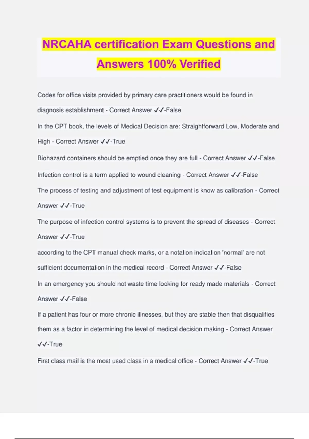 NRCAHA certification Exam Questions and Answers 100% Verified Codes for office visits provided by primary care practitioners would be found in diagnosis establishment - Correct Answer ️️ -False In the CPT book, the levels of Medical Decision are: Straightforward Low, Moderate and High - Correct Answer ️️ -True Biohazard containers should be emptied once they are full - Correct Answer ️️ -False Infection control is a term applied to wound cleaning - Correct Answer ️️ -False The process of testing and adjustment of test equipment is know as calibration - Correct Answer ️️ -True The purpose of infection control systems is to prevent the spread of diseases - Correct Answer ️️ -True according to the CPT manual check marks, or a notation indication 'normal' are not sufficient documentation in the medical record - Correct Answer ️️ -False In an emergency you should not waste time looking for ready made materials - Correct Answer ️️ -False If a patient has four or more chronic illnesses, but they are stable then that disqualifies them as a factor in determining the level of medical decision making - Correct Answer ️️ -True First class mail is the most used class in a medical office - Correct Answer ️️ -True Hands should be washed with soup and warm water immediately after providing care, even if gloves were worn - Correct Answer ️️ -True a policy and procedure manual should include the diagnosis that the doctor deals with - Correct Answer ️️ -False The best method of scheduling appointments differs from office to office depending on the goals of the physician and staff - Correct Answer ️️ -True The most effective tool that the medical office can have as a guiding principle of maintaining high standards is a good office manager - Correct Answer ️️ -False A description of the steps that should be utilized to handle a specific situation or to perform a certain task should be included in a procedure manual - Correct Answer ️️ - True The schedule that allows five refills of a drug in six months as long as it is written on the original prescription is schedule III - Correct Answer ️️ -True In clinical areas sharps are not considered dangerous at all - Correct Answer ️️ -False The programs that allow the computer operator to perform various tasks are CPUs - Correct Answer ️️ -False A list of the specific items under each division of the order of business is the minutes - Correct Answer ️️ -False Medications and prescription pads should be kept in a locked cabinet - Correct Answer ️️ -True Classification systems should be updated every year - Correct Answer ️️ -True Collection agencies retain up to 20% of the amount collected on an overdue bill - Correct Answer ️️ -False If the patient complains of thirst, wet their lips with a wet towel - Correct Answer ️️ - True Hazardous prevention procedure are procedures introduced in 1987 that were developed by the Center of Disease Control and Prevention to prevent the spread of blood borne infection - Correct Answer ️️ -False Minor routine office maintenance is usually done by staff - Correct Answer ️️ -True CPT updates are available from the Department of Health and Human Services - Correct Answer ️️ -False wound repairs can be divided into: simple, intermediate, and complex - Correct Answer ️️ -True The DRG system serves as strict guidelines for hospital admissions and stays - Correct Answer ️️ -True The goal of office management in a medical practice is creating an environment in which employees can work effectively as team members - Correct Answer ️️ -True In the laboratory, quality assurance is a comprehensive set of policies and procedures developed to assess the responsibility of a test result - Correct Answer ️️ -True The postage class Most used in the medical office is - Correct Answer ️️ -First class mail Staff meetings should be used to do all the following except - Correct Answer ️️ -Have a form to discuss employee complaints When supplies which have been newly ordered arrive in the office they should be - Correct Answer ️️ -Checked against the packing slip to make sure that everything that has been ordered has arrived The device that allows the computer operator to manipulate the cursor without us