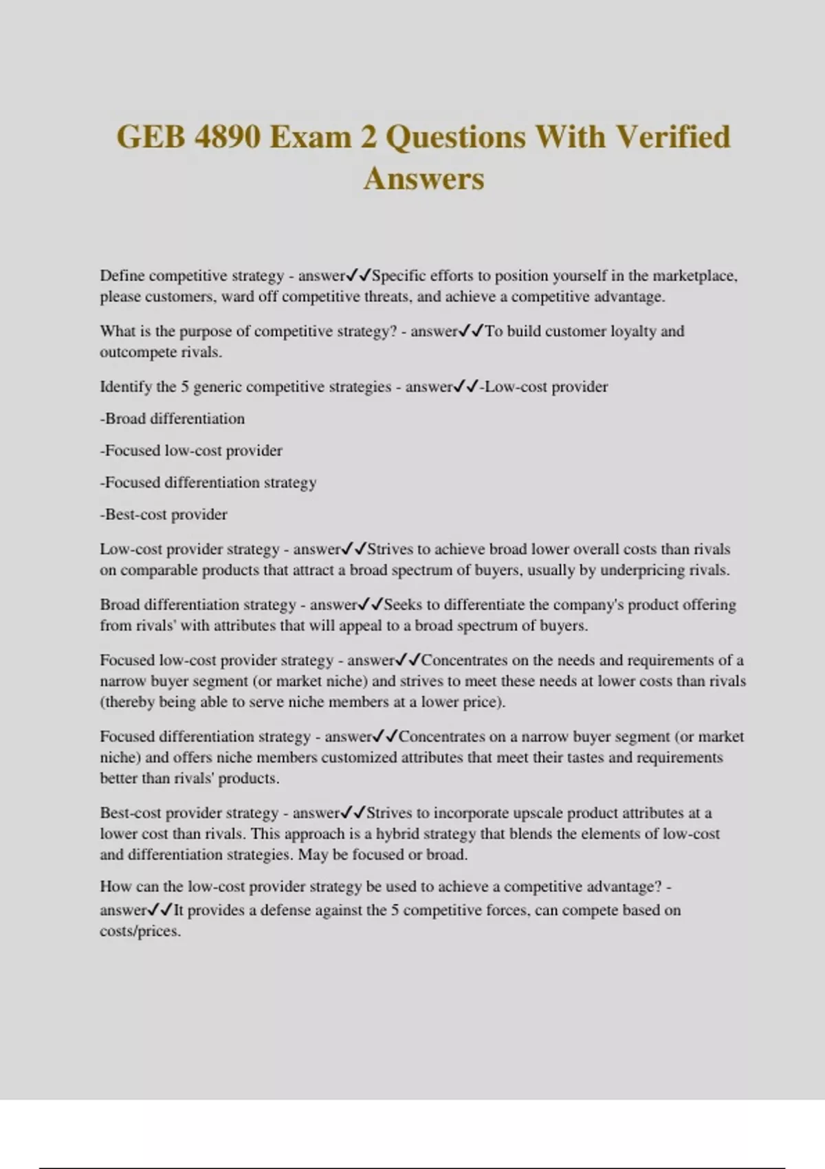 GEB 4890 Exam 2 Questions With Verified Answers Define competitive strategy - answerSpecific efforts to position yourself in the marketplace, please customers, ward off competitive threats, and achieve a competitive advantage. What is the purpose of competitive strategy? - answerTo build customer loyalty and outcompete rivals. Identify the 5 generic competitive strategies - answer-Low-cost provider -Broad differentiation -Focused low-cost provider -Focused differentiation strategy -Best-cost provider Low-cost provider strategy - answerStrives to achieve broad lower overall costs than rivals on comparable products that attract a broad spectrum of buyers, usually by underpricing rivals. Broad differentiation strategy - answerSeeks to differentiate the company's product offering from rivals' with attributes that will appeal to a broad spectrum of buyers. Focused low-cost provider strategy - answerConcentrates on the needs and requirements of a narrow buyer segment (or market niche) and strives to meet these needs at lower costs than rivals (thereby being able to serve niche members at a lower price). Focused differentiation strategy - answerConcentrates on a narrow buyer segment (or market niche) and offers niche members customized attributes that meet their tastes and requirements better than rivals' products. Best-cost provider strategy - answerStrives to incorporate upscale product attributes at a lower cost than rivals. This approach is a hybrid strategy that blends the elements of low-cost and differentiation strategies. May be focused or broad. How can the low-cost provider strategy be used to achieve a competitive advantage? - answerIt provides a defense against the 5 competitive forces, can compete based on costs/prices. Identify and describe the 2 major avenues for achieving a cost advantage in an industry - answer-Cost-efficient management of value-chain: improves how existing value chain activities are performed, identifies cost drivers to reduce costs. -Revamping value-chain system: eliminates costly work steps, bypasses cost producing value chain activities. Explain the keys to success in achieving low-cost leadership. - answer-Be proactive -Invest/spend to reduce costs -Champion frugality. Describe situations when a low-cost provider strategy works best. - answer-Price competition among rivals is vigorous -Products of rivals are essentially identical -There is difficulty to achieve product differentiation -Most buyers use the product in the same way -Buyers incur low costs in switching sellers Identify and describe pitfalls of a low-cost provider strategy. - answer-Overly aggressive price cutting -Too much fixation on cost reduction -Using cost reduction approaches that can be easily copied Explain how the differentiation strategy can be used to achieve a competitive advantage - answerProvides a defense against the 5 competitive forces, can build customer loyalty/brand preferences. Key is to offer a product that is different and for these differences to be important to buyers. Describe where in the value chain a differentiation advantage can be achieved. - answer- Managing the value-chain to create differentiation: identifies differentiation opportunities across value-chain, identifies value drivers to create differentiation. -Revamping value-chain system: coordinates with downstream value-chain allies, coordinates with suppliers. Describe situations when a differentiation strategy works best. - answer-Buyer needs and uses of the product are diverse -There are many ways to differentiate the product or service -Few rivals are following similar approaches -Technological change is fast-paced and competition revolves rapidly