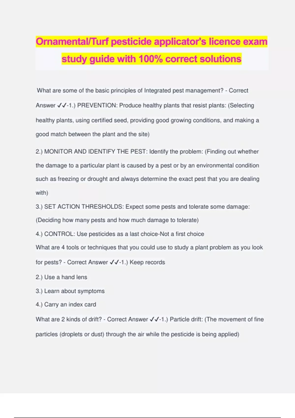 Ornamental/Turf pesticide applicator's licence exam study guide with 100% correct solutions What are some of the basic principles of Integrated pest management? - Correct Answer ️️ -1.) PREVENTION: Produce healthy plants that resist plants: (Selecting healthy plants, using certified seed, providing good growing conditions, and making a good match between the plant and the site) 2.) MONITOR AND IDENTIFY THE PEST: Identify the problem: (Finding out whether the damage to a particular plant is caused by a pest or by an environmental condition such as freezing or drought and always determine the exact pest that you are dealing with) 3.) SET ACTION THRESHOLDS: Expect some pests and tolerate some damage: (Deciding how many pests and how much damage to tolerate) 4.) CONTROL: Use pesticides as a last choice-Not a first choice What are 4 tools or techniques that you could use to study a plant problem as you look for pests? - Correct Answer ️️ -1.) Keep records 2.) Use a hand lens 3.) Learn about symptoms 4.) Carry an index card What are 2 kinds of drift? - Correct Answer ️️ -1.) Particle drift: (The movement of fine particles (droplets or dust) through the air while the pesticide is being applied) 2.) Vapor drift: (The movement of the pesticide in the form of a gas or vapor during or after application) What is a Buffer? - Correct Answer ️️ -This is the non treated zone between the area to be treated and sensitive areas such as ponds, streams, wells, and drains What is a Re-entry period? - Correct Answer ️️ -The length of time that must pass before anyone can enter a treated area Resistance to pesticides come from... - Correct Answer ️️ -Using the same pesticides over and over again What will happen to Pesticides in the soil over time? - Correct Answer ️️ -They are eventually broken down by bacteria and fungi When should you apply a pesticide? - Correct Answer ️️ -When pests are abundant enough cause unacceptable damage What hand lens magnification is recommended for insect identification? - Correct Answer ️️ -5 power to 10 power What should you do in an IPM program? - Correct Answer ️️ -Produce healthy plants that can resist pests Why should pesticide application be the last choice in pest management? - Correct Answer ️️ -Because they are labeled for use only on specific pests and types of plants and because it is safer to use other controls What is Integrated pest management (IPM) ? - Correct Answer ️️ -It is an effective and environmentally sensitive approach to pest management that relies on a combination of common-sense practices. IPM programs use current, comprehensive information on the life cycles of pests and their interaction with the environment What is Phytotoxicity? - Correct Answer ️️ -A toxic effect by a compound on plant growth What is Pesticide breakdown? - Correct Answer ️️ -The breakdown of pesticides into non-toxic substances from bacteria and fungi in the soil What is a Threshold? - Correct Answer ️️ -A point at which pest populations or environmental conditions indicate that pest control action must be taken What are the strategies that delay the development of pesticide resistance? - Correct Answer ️️ -Using a pesticide only when needed and choosing alternative pesticides from different chemical classes What is an Indicator plant? - Correct Answer ️️ -Plants that can indicate the onset of a pest infestation What does proper mowing mean? - Correct Answer ️️ -Using sharp mower blades to make a clean cut What do you need to do to promote healthy turf and reduce disease? - Correct Answer ️️ -Water thoroughly when you first see wilting What should you do when fertilizing? - Correct Answer ️️ -Determine fertilizer need through results of a soil test Cool-season cultivars... - Correct Answer ️️ -Can be mixed to minimize disease What does good soil drainage do? - Correct Answer ️️ -Promotes healthy tu
