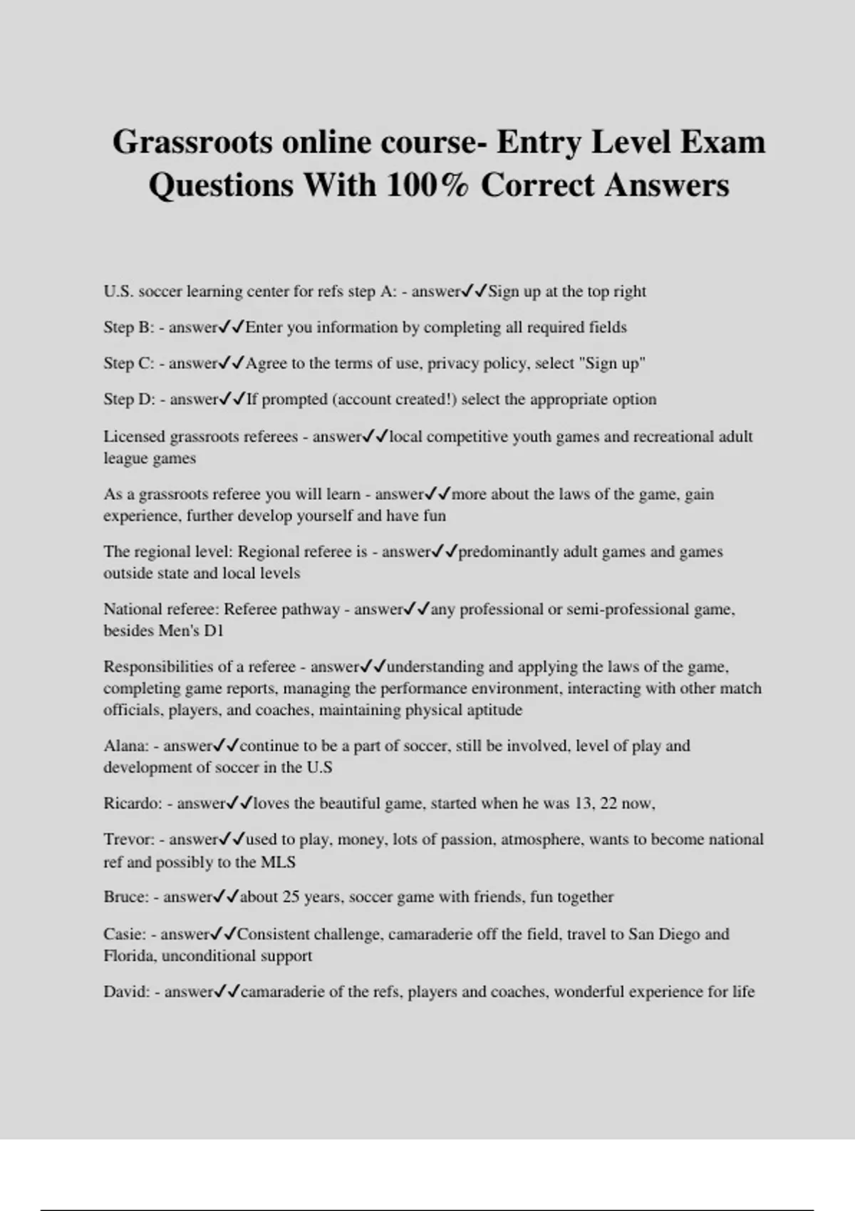 Grassroots online course- Entry Level Exam Questions With 100% Correct Answers U.S. soccer learning center for refs step A: - answerSign up at the top right Step B: - answerEnter you information by completing all required fields Step C: - answerAgree to the terms of use, privacy policy, select "Sign up" Step D: - answerIf prompted (account created!) select the appropriate option Licensed grassroots referees - answerlocal competitive youth games and recreational adult league games As a grassroots referee you will learn - answermore about the laws of the game, gain experience, further develop yourself and have fun The regional level: Regional referee is - answerpredominantly adult games and games outside state and local levels National referee: Referee pathway - answerany professional or semi-professional game, besides Men's D1 Responsibilities of a referee - answerunderstanding and applying the laws of the game, completing game reports, managing the performance environment, interacting with other match officials, players, and coaches, maintaining physical aptitude Alana: - answercontinue to be a part of soccer, still be involved, level of play and development of soccer in the U.S Ricardo: - answerloves the beautiful game, started when he was 13, 22 now, Trevor: - answerused to play, money, lots of passion, atmosphere, wants to become national ref and possibly to the MLS Bruce: - answerabout 25 years, soccer game with friends, fun together Casie: - answerConsistent challenge, camaraderie off the field, travel to San Diego and Florida, unconditional support David: - answercamaraderie of the refs, players and coaches, wonderful experience for life