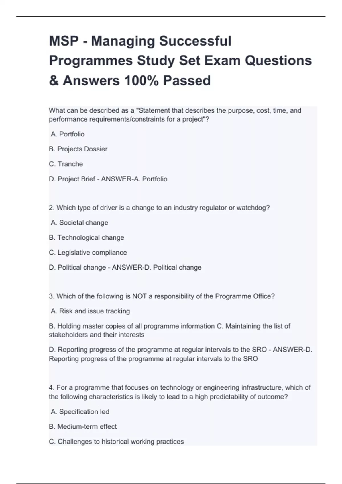 What can be described as a "Statement that describes the purpose, cost, time, and performance requirements/constraints for a project"? A. Portfolio B. Projects Dossier C. Tranche D. Project Brief - ANSWER-A. Portfolio 2. Which type of driver is a change to an industry regulator or watchdog? A. Societal change B. Technological change C. Legislative compliance D. Political change - ANSWER-D. Political change 3. Which of the following is NOT a responsibility of the Programme Office? A. Risk and issue tracking B. Holding master copies of all programme information C. Maintaining the list of stakeholders and their interests D. Reporting progress of the programme at regular intervals to the SRO - ANSWER-D. Reporting progress of the programme at regular intervals to the SRO 4. For a programme that focuses on technology or engineering infrastructure, which of the following characteristics is likely to lead to a high predictability of outcome? A. Specification led B. Medium-term effect C. Challenges to historical working practices D. Diverse or new products and services - ANSWER-A. Specification led