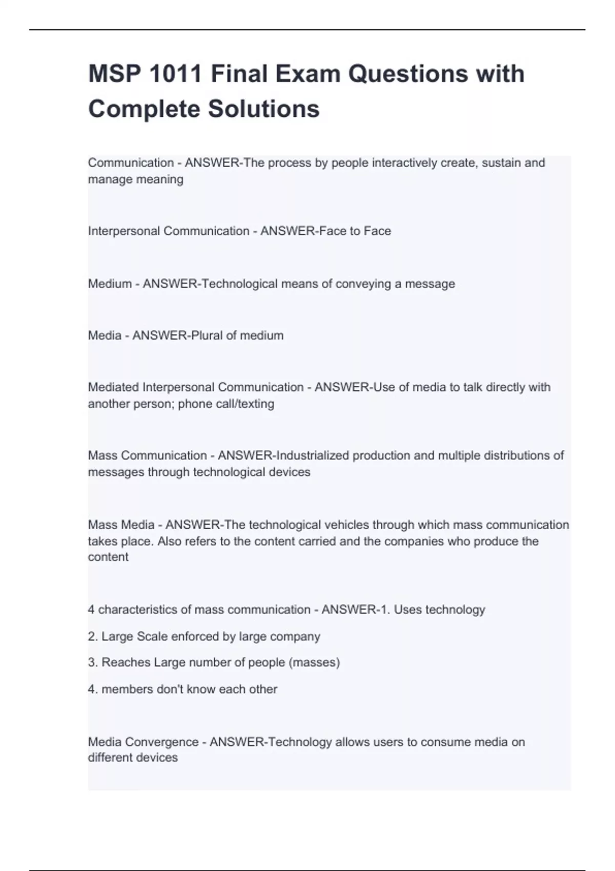 Communication - ANSWER-The process by people interactively create, sustain and manage meaning Interpersonal Communication - ANSWER-Face to Face Medium - ANSWER-Technological means of conveying a message Media - ANSWER-Plural of medium Mediated Interpersonal Communication - ANSWER-Use of media to talk directly with another person; phone call/texting Mass Communication - ANSWER-Industrialized production and multiple distributions of messages through technological devices Mass Media - ANSWER-The technological vehicles through which mass communication takes place. Also refers to the content carried and the companies who produce the content 4 characteristics of mass communication - ANSWER-1. Uses technology 2. Large Scale enforced by large company 3. Reaches Large number of people (masses) 4. members don't know each other Media Convergence - ANSWER-Technology allows users to consume media on different devices