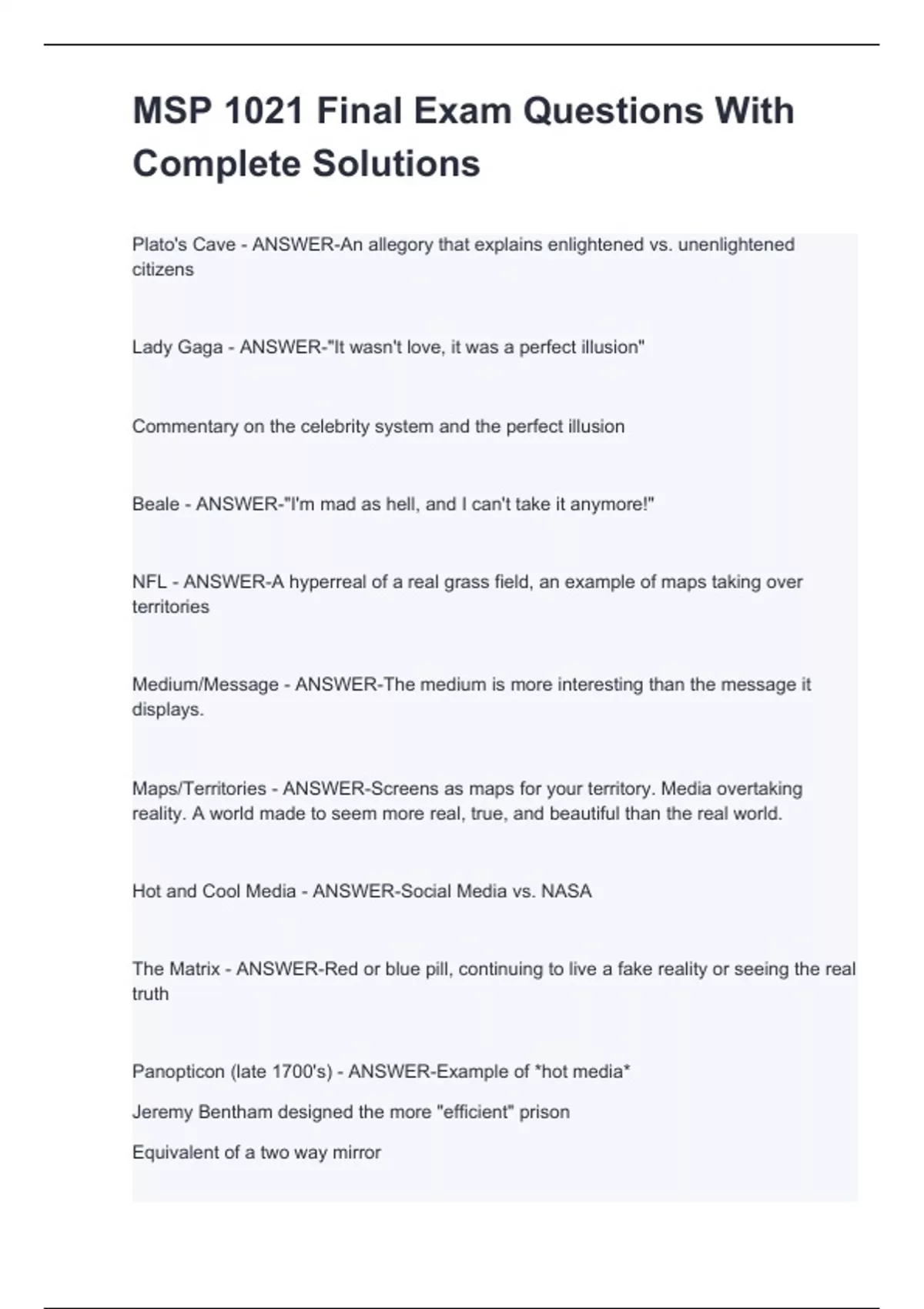 Plato's Cave - ANSWER-An allegory that explains enlightened vs. unenlightened citizens Lady Gaga - ANSWER-"It wasn't love, it was a perfect illusion" Commentary on the celebrity system and the perfect illusion Beale - ANSWER-"I'm mad as hell, and I can't take it anymore!" NFL - ANSWER-A hyperreal of a real grass field, an example of maps taking over territories Medium/Message - ANSWER-The medium is more interesting than the message it displays. Maps/Territories - ANSWER-Screens as maps for your territory. Media overtaking reality. A world made to seem more real, true, and beautiful than the real world. Hot and Cool Media - ANSWER-Social Media vs. NASA The Matrix - ANSWER-Red or blue pill, continuing to live a fake reality or seeing the real truth Panopticon (late 1700's) - ANSWER-Example of *hot media* Jeremy Bentham designed the more "efficient" prison Equivalent of a two way mirror The few watch the many