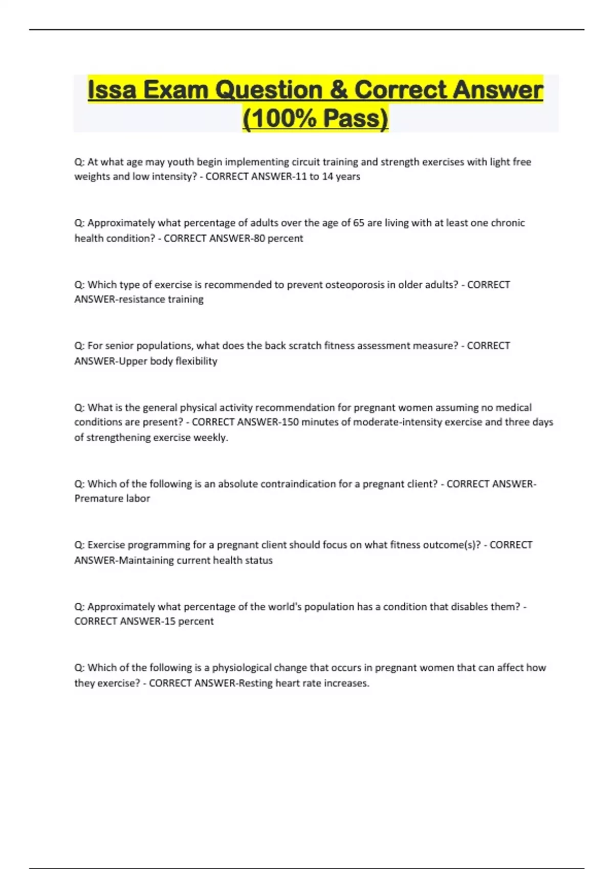 Issa Exam Question & Correct Answer (100% Pass) Q: At what age may youth begin implementing circuit training and strength exercises with light free weights and low intensity? - CORRECT ANSWER-11 to 14 years Q: Approximately what percentage of adults over the age of 65 are living with at least one chronic health condition? - CORRECT ANSWER-80 percent Q: Which type of exercise is recommended to prevent osteoporosis in older adults? - CORRECT ANSWER-resistance training Q: For senior populations, what does the back scratch fitness assessment measure? - CORRECT ANSWER-Upper body flexibilit