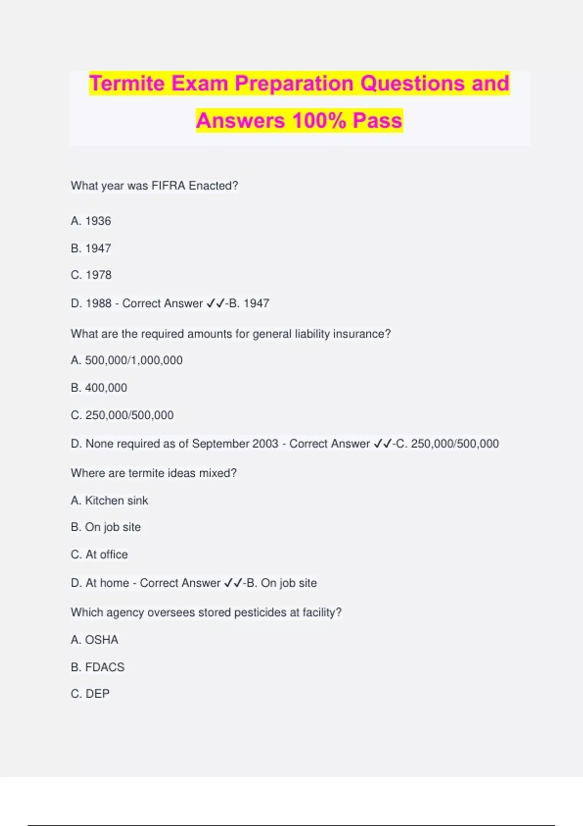 Termite Exam Preparation Questions and Answers 100% Pass What year was FIFRA Enacted? A. 1936 B. 1947 C. 1978 D. 1988 - Correct Answer ️️ -B. 1947 What are the required amounts for general liability insurance? A. 500,000/1,000,000 B. 400,000 C. 250,000/500,000 D. None required as of September 2003 - Correct Answer ️️ -C. 250,000/500,000 Where are termite ideas mixed? A. Kitchen sink B. On job site C. At office D. At home - Correct Answer ️️ -B. On job site Which agency oversees stored pesticides at facility? A. OSHA B. FDACS C. DEP D. FDCA - Correct Answer ️️ -D. FDCA Where would you put visible evidence or damage that cannot be verified on the WDO report? A. In comments area B. In visible evidence area C. In evidence area D. Unverified WDO are not reported on report - Correct Answer ️️ -A. In comments area Which would not be reportable visible evidence of previous treatment? A. Valid WDO contract of treatment B. Treatment posted label C. Alate wings D. Drill holes in slab - Correct Answer ️️ -C. Alate wings Attic opening for inspection should be a minimum size of................? A. 2x2 feet B. 2x3 feet C. 20x20 inches D. 30x36 inches - Correct Answer ️️ -C. 20x20 inches Which slab may be more vulnerable allowing entrance of subs? A. Monolithic B. Supported C. Floating D. Partially supported - Correct Answer ️️ -C. Floating Where do bark beetles live? A. On bark B. In bark C. In sap D. Within cambium - Correct Answer ️️ -D. Within cambium How would you calibrate your application equipment? A. Use your flow meter B. Measure how long it takes you to treat an area 1,000 sq ft C. Measure how much you collect in one minute in a bucket D. Factory settings do not need calibration - Correct Answer ️️ -C. Measure how much you collect in one minute in a bucket How would you remove Beatles from firewood? A. Freeze wood B. Burn wood C. Spray with pesticides D. Give wood to annoying neighbor as holiday gift - Correct Answer ️️ -A. Freeze wood Which is the minimum entrance size of the opening to crawl space ne