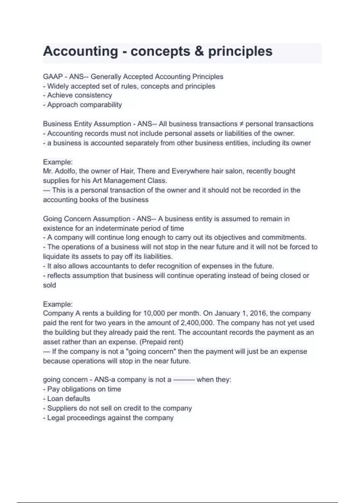 Business Entity Assumption - ANS-- All business transactions ≠ personal transactions