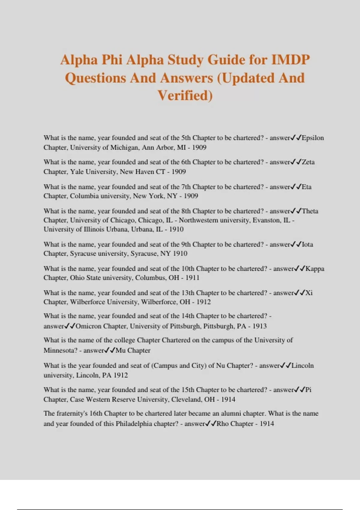 Alpha Phi Alpha Study Guide for IMDP Questions And Answers (Updated And Verified) What is the name, year founded and seat of the 5th Chapter to be chartered? - answerEpsilon Chapter, University of Michigan, Ann Arbor, MI - 1909 What is the name, year founded and seat of the 6th Chapter to be chartered? - answerZeta Chapter, Yale University, New Haven CT - 1909 What is the name, year founded and seat of the 7th Chapter to be chartered? - answerEta Chapter, Columbia university, New York, NY - 1909 What is the name, year founded and seat of the 8th Chapter to be chartered? - answerTheta Chapter, University of Chicago, Chicago, IL - Northwestern university, Evanston, IL - University of Illinois Urbana, Urbana, IL - 1910 What is the name, year founded and seat of the 9th Chapter to be chartered? - answerIota Chapter, Syracuse university, Syracuse, NY 1910 What is the name, year founded and seat of the 10th Chapter to be chartered? - answerKappa Chapter, Ohio State university, Columbus, OH - 1911 What is the name, year founded and seat of the 13th Chapter to be chartered? - answerXi Chapter, Wilberforce University, Wilberforce, OH - 1912 What is the name, year founded and seat of the 14th Chapter to be chartered? - answerOmicron Chapter, University of Pittsburgh, Pittsburgh, PA - 1913 What is the name of the college Chapter Chartered on the campus of the University of Minnesota? - answerMu Chapter What is the year founded and seat of (Campus and City) of Nu Chapter? - answerLincoln university, Lincoln, PA 1912 What is the name, year founded and seat of the 15th Chapter to be chartered? - answerPi Chapter, Case Western Reserve University, Cleveland, OH - 1914 The fraternity's 16th Chapter to be chartered later became an alumni chapter. What is the name and year founded of this Philadelphia chapter? - answerRho Chapter - 1914