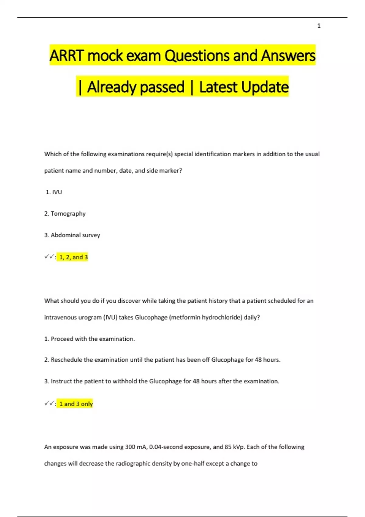 Which of the following examinations require(s) special identification markers in addition to the usual patient name and number, date, and side marker? 1. IVU 2. Tomography 3. Abdominal survey : 1, 2, and 3 What should you do if you discover while taking the patient history that a patient scheduled for an intravenous urogram (IVU) takes Glucophage (metformin hydrochloride) daily? 1. Proceed with the examination. 2. Reschedule the examination until the patient has been off Glucophage for 48 hours. 3. Instruct the patient to withhold the Glucophage for 48 hours after the examination. : 1 and 3 only An exposure was made using 300 mA, 0.04-second exposure, and 85 kVp. Each of the following changes will decrease the radiographic density by one-half except a change to 2 : 10 mAs LET is best defined as 1. a method of expressing radiation quality. 2. a measure of the rate at which radiation energy is transferred to soft tissue. 3. absorption of polyenergetic radiation.00 : 1, 2, and