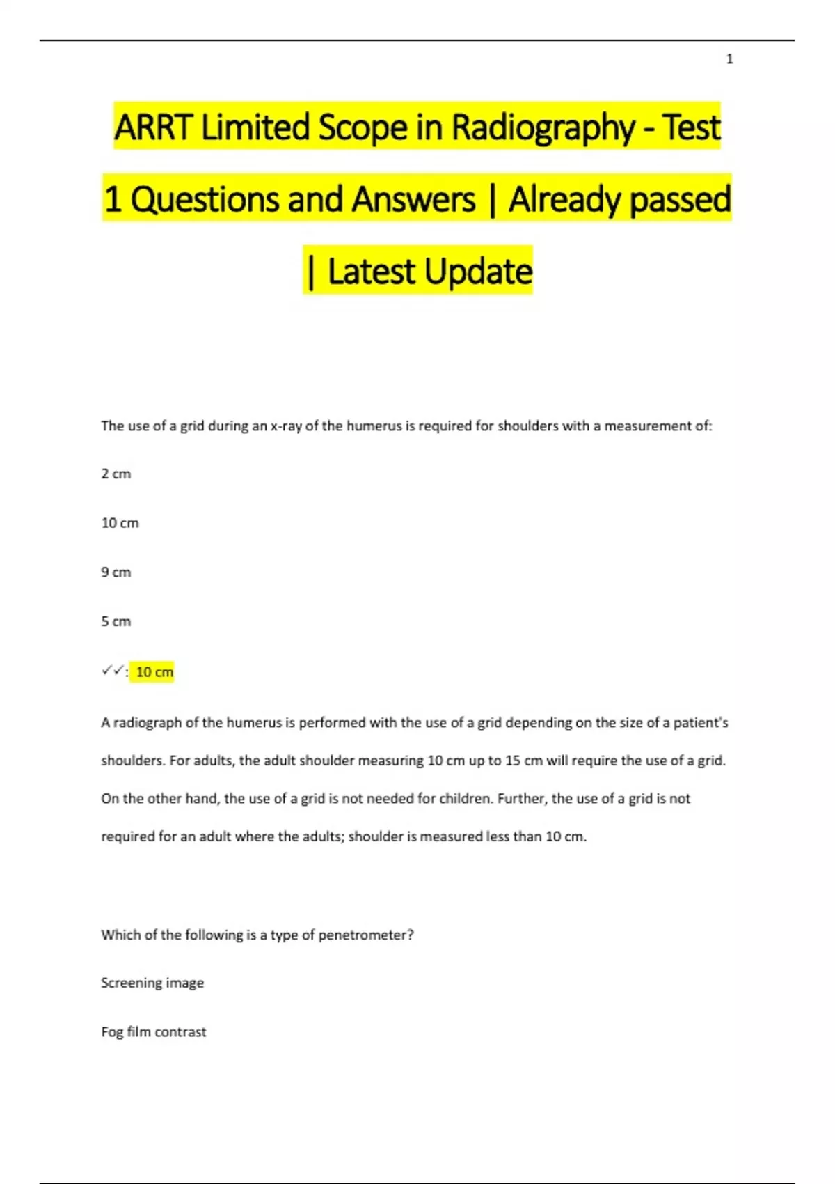 ARRT Limited Scope in Radiography - Test 1 Questions and Answers | Already passed | Latest Update