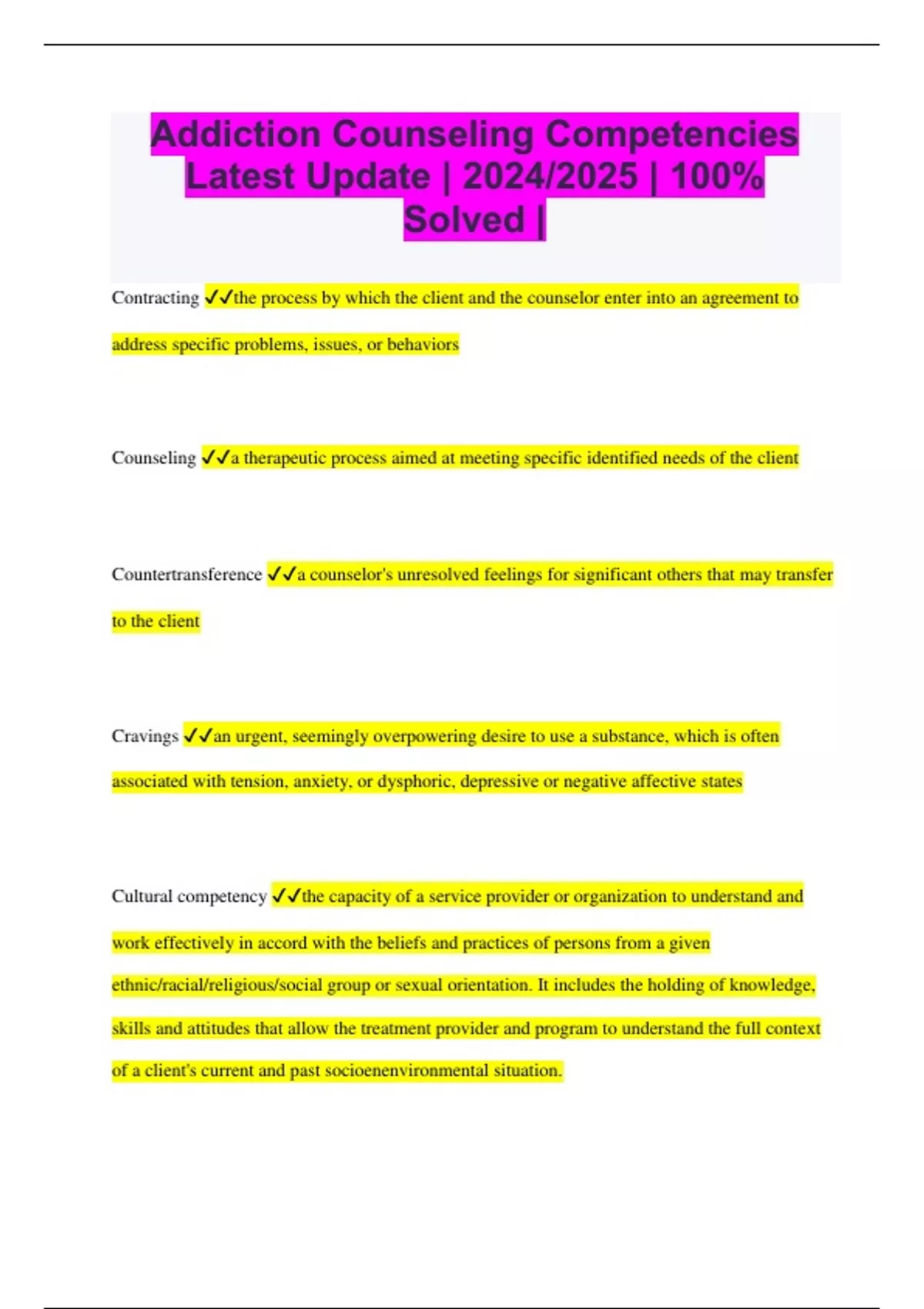 Addiction Counseling Competencies Latest Update | 2024/2025 | 100% Solved | Contracting the process by which the client and the counselor enter into an agreement to address specific problems, issues, or behaviors Counseling a therapeutic process aimed at meeting specific identified needs of the client Countertransference a counselor's unresolved feelings for significant others that may transfer to the client Cravings an urgent, seemingly overpowering desire to use a substance, which is often associated with tension, anxiety, or dysphoric, depressive or negative affective states Cultural competency the capacity of a service provider or organization to understand and work effectively in accord with the beliefs and practices of persons from a given ethnic/racial/religious/social group or sexual orientation. It includes the holding of knowledge, skills and attitudes that allow the treatment provider and program to understand the full context of a client's current and past socioenenvironmental situation. Cultural diversity the vast array of different cultural groups based on varying behaviors, attitudes, values, languages, celebrations, rituals, and histories Culture the vast structure of behaviors, ideas, attitudes, values, beliefs, customs, languages, rituals, ceremonies, histories, and practices distinctive to a particular group of people Diagnosis classification of the nature and severity of a substance use, medical, mental health, or other problems present. DSM-IV_TR and ICD-10 commonly are used to classify substance use and mental disorders Disorder an affliction that affects the functions of the mind and/or body, disturbing physical and or mental health Active Listening a counseling skill that enhances rapport and demonstrates interest and understanding through the use of verbal and nonverbal acknowledgement of client statements Addiction a chronic, relapsing disease of the brain with social and behavioral manifestations marked by continued alcohol or drug use despite negative consequences Addiction Counseling professional and ethical application of specific competencies that constitute eight practice dimensions, including clinical evaluation; treatment planning; referral; service coordination; individual, group, and family counseling;