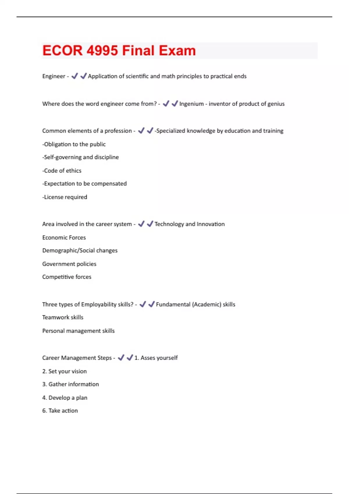 Engineer - Application of scientific and math principles to practical ends Where does the word engineer come from? - Ingenium - inventor of product of genius Common elements of a profession - -Specialized knowledge by education and training -Obligation to the public -Self-governing and discipline -Code of ethics -Expectation to be compensated -License required Area involved in the career system - Technology and Innovation Economic Forces Demographic/Social changes Government policies Competitive forces Three types of Employability skills? - Fundamental (Academic) skills Teamwork skills Personal management skills Career Management Steps - 1. Asses yourself 2. Set your vision 3. Gather information 4. Develop a plan 6. Take action3 keys to successful communication? - 1. Organize your content 2. Know your audience 3. Be confident What are the 4 R's for defining your task? - Reason Reader Restrictions Research What is Engineers Canada? - National voice of Canadian engineering profession Unites the 12 provincial/territorial regulators 4 objectives of Engineers Canada? - 1. Fostering regulatory excellence 2. Building public confidence 3. Promoting the sustainability of the profession 4. Protecting the engineering term