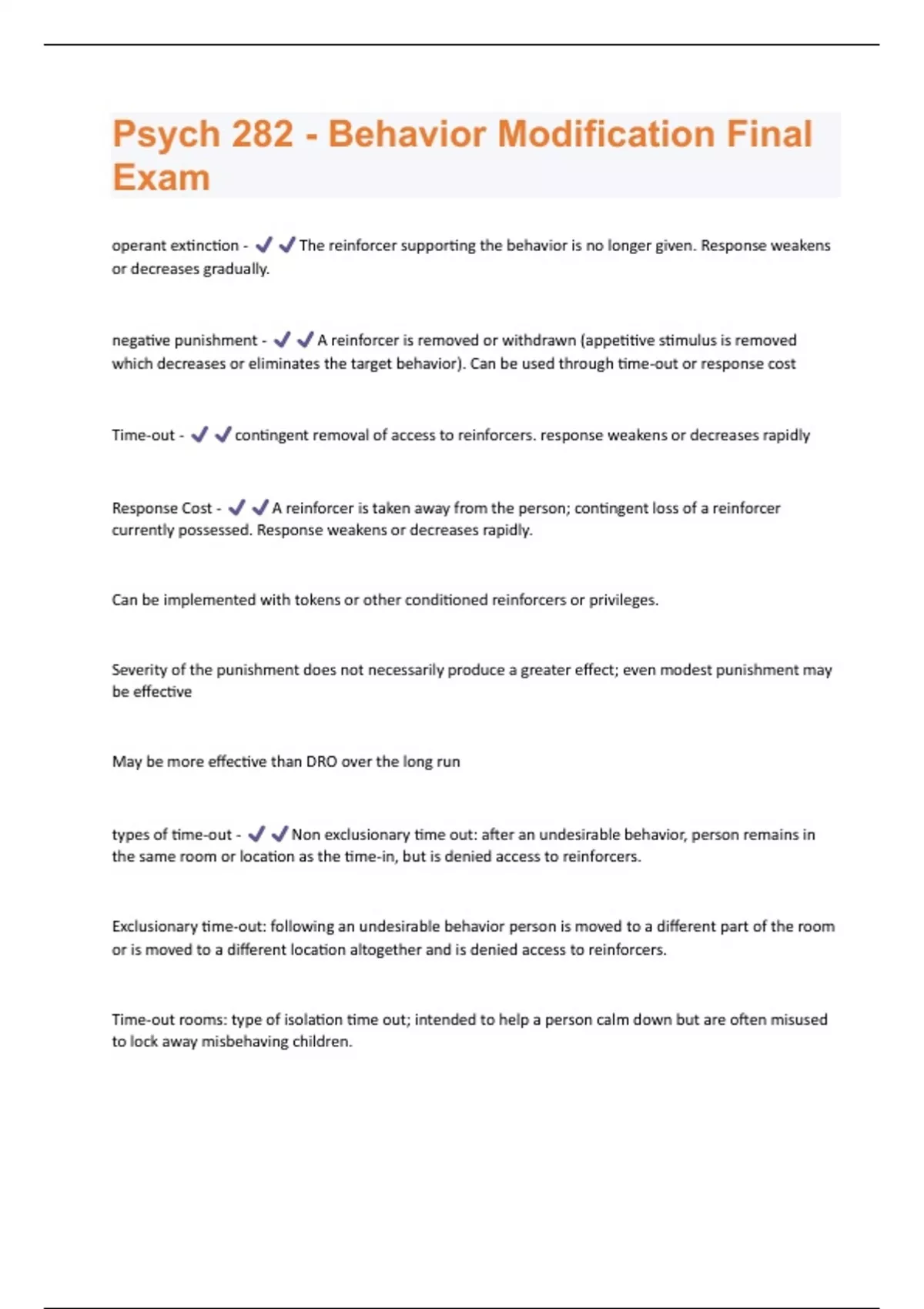 operant extinction - The reinforcer supporting the behavior is no longer given. Response weakens or decreases gradually. negative punishment - A reinforcer is removed or withdrawn (appetitive stimulus is removed which decreases or eliminates the target behavior). Can be used through time-out or response cost Time-out - contingent removal of access to reinforcers. response weakens or decreases rapidly Response Cost - A reinforcer is taken away from the person; contingent loss of a reinforcer currently possessed. Response weakens or decreases rapidly. Can be implemented with tokens or other conditioned reinforcers or privileges. Severity of the punishment does not necessarily produce a greater effect; even modest punishment may be effective May be more effective than DRO over the long run types of time-out - Non exclusionary time out: after an undesirable behavior, person remains in the same room or location as the time-in, but is denied access to reinforcers. Exclusionary time-out: following an undesirable behavior person is moved to a different part of the room or is moved to a different location altogether and is denied access to reinforcers. Time-out rooms: type of isolation time out; intended to help a person calm down but are often misused to lock away misbehaving ngent observation - part of a non exclusionary time-out, but makes it more salient. Person is denied access to reinforcers, and must observe others engaging in desirable activities. Time-out issues - 1. Time out decreases undesirable behaviours, but desirable behaviours should also be encouraged 2. consider the reinforcer: time-out does not work with negative reinforcement (escape) or automatic reinforcement (self stimulation0 also, ensure the time-in provides reinforcers 3. practical concerns: space for exclusionary time out, can person be physically. moved, is it safe, etc. 4. consider duration of time-out period: use shortest duration that is still effective 5. prevent escape from time out 6. consider if it is appropriate to use with vulnerable populations Contingent delay (release contingency) - time-out does not end if behavior has not ceased during the time-out period, this prevents escape from time-out from serving as negative reinforcement response cost examples - paying a fine for parking illegally, eliminating food stealing/scavenging for. non food items, increased completion of math problems by reducing off task behavior, etc. Response Cost Issues - 1. consider the reinforcer: what will be withdrawn, how much, and for how long 2. when to withdraw the reinforcer: immediately, or after a delay? For those with intellectual impairment, remove reinforcer immediately; if using a delay, inform people immediately 3. practical issues: if reinforcer cannot be physically taken away, use tokens or points system instead 4. ensure contingencies are explained in advance: person may avoid the situation or become aggressive 5. determine whether it is acceptable for vulnerable populations or at the given institution positive punishment - includes applying aversive activities or aversive stimuli Applying aversive activities - involves low probability behavior that the person does not enjoy doing. Acts as a punisher if it follows a behavior and decreases it.Kinds of Aversive Activities (4 main w/subtypes) - Overcorrection: person has to perform effortful, low probability behaviours contingent on the problem behavior. Involves positive practice, negative practice, and restitution. Contingent exercise: after a problem behavior, a person must perform exercise, usually not related to the problem behavior Guided compliance: after a problem behavior, person is physically guided to complete a requested behaviour Physical restraint: after a problem behavior, the part of a persons body that performed the behavior is immobilized. Involves response blocking and response interruption/redirection (RIR) 3 Types of Overcorrection in Applying Aversive Activities - Positive Practice: after a problem behavior, person must correctly perform an opposite or appropriate behavior repeatedly Negative Practice: after a problem behavior, person must perform the undesirable behavior repeatedly Restitution: after problem behavior, person must correct the effects of the problem behavior and restore the environment, often to a condition better than it was before 2 Types of Physical Restraint in Applying Aversive Activities - Response Blocking: behavior analyst physically prevents the person from carrying out or completing the problem behavior Response Interruption/Redirection: combines response blocking and differential reinforcement. After a response is blocked, person is prompted to engage in a competing response using a least to most prompting hierarchy . Used as treatment for automatically reinforcing behaviours.