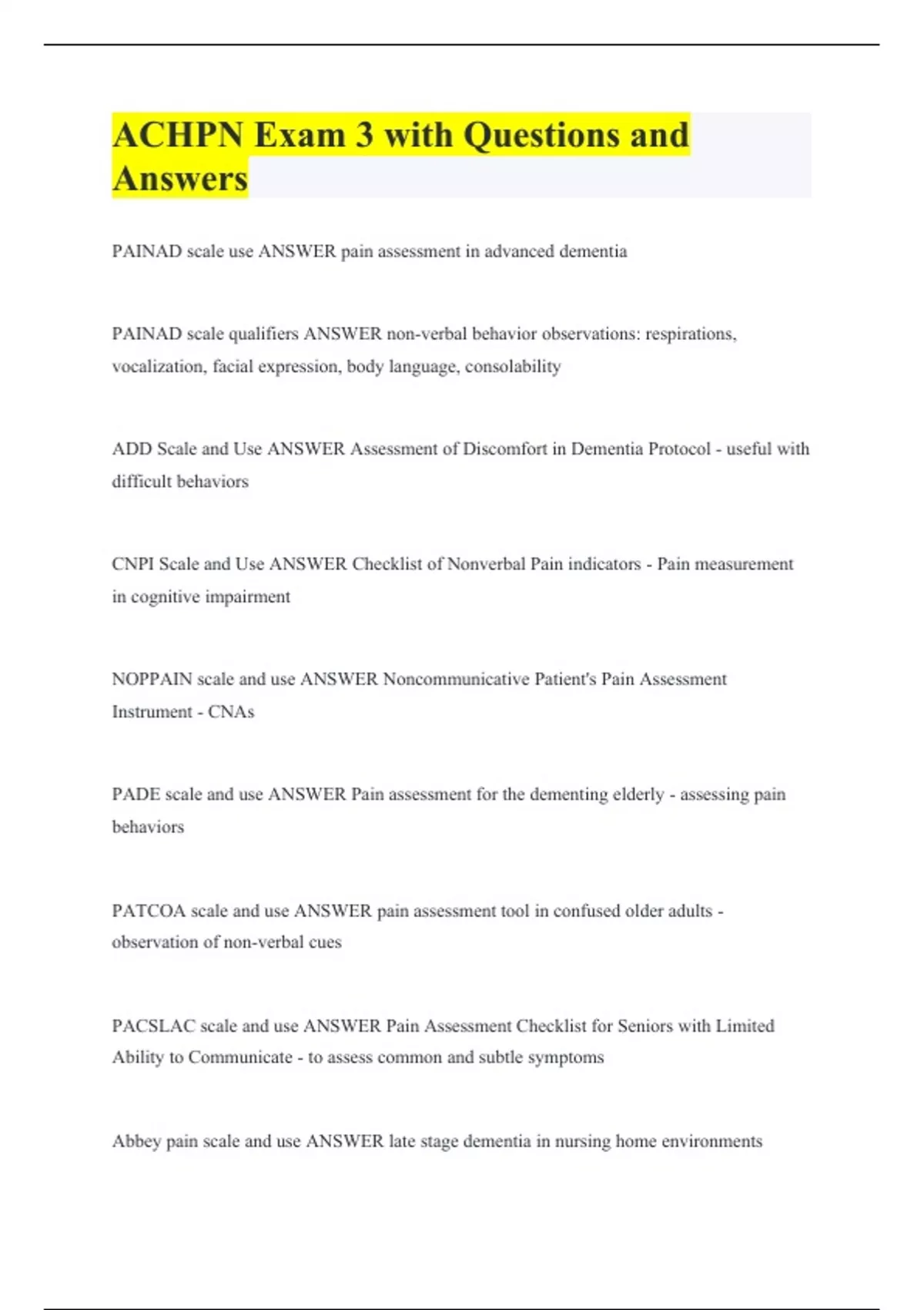 ACHPN Exam 3 with Questions and Answers PAINAD scale use ANSWER pain assessment in advanced dementia PAINAD scale qualifiers ANSWER non-verbal behavior observations: respirations, vocalization, facial expression, body language, consolability ADD Scale and Use ANSWER Assessment of Discomfort in Dementia Protocol - useful with difficult behaviors CNPI Scale and Use ANSWER Checklist of Nonverbal Pain indicators - Pain measurement in cognitive impairment NOPPAIN scale and use ANSWER Noncommunicative Patient's Pain Assessment Instrument - CNAs PADE scale and use ANSWER Pain assessment for the dementing elderly - assessing pain behaviors PATCOA scale and use ANSWER pain assessment tool in confused older adults - observation of non-verbal cues PACSLAC scale and use ANSWER Pain Assessment Checklist for Seniors with Limited Ability to Communicate - to assess common and subtle symptoms Abbey pain scale and use ANSWER late stage dementia in nursing home environments