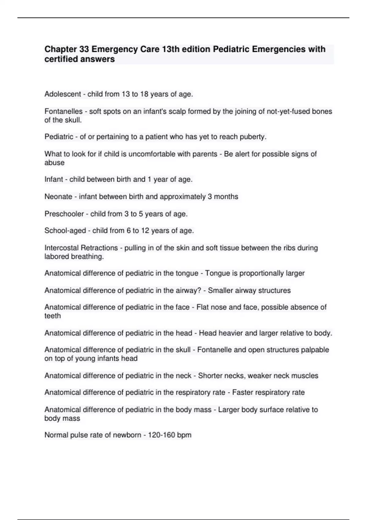 Chapter 33 Emergency Care 13th edition Pediatric Emergencies with certified answers Adolescent - child from 13 to 18 years of age. Fontanelles - soft spots on an infant's scalp formed by the joining of not-yet-fused bones of the skull. Pediatric - of or pertaining to a patient who has yet to reach puberty. What to look for if child is uncomfortable with parents - Be alert for possible signs of abuse Infant - child between birth and 1 year of age. Neonate - infant between birth and approximately 3 months Preschooler - child from 3 to 5 years of age. School-aged - child from 6 to 12 years of age. Intercostal Retractions - pulling in of the skin and soft tissue between the ribs during labored breathing. Anatomical difference of pediatric in the tongue - Tongue is proportionally larger Anatomical difference of pediatric in the airway? - Smaller airway structures Anatomical difference of pediatric in the face - Flat nose and face, possible absence of teeth Anatomical difference of pediatric in the head - Head heavier and larger relative to body. Anatomical difference of pediatric in the skull - Fontanelle and open structures palpable on top of young infants head Anatomical difference of pediatric in the neck - Shorter necks, weaker neck muscles Anatomical difference of pediatric in the respiratory rate - Faster respiratory rate