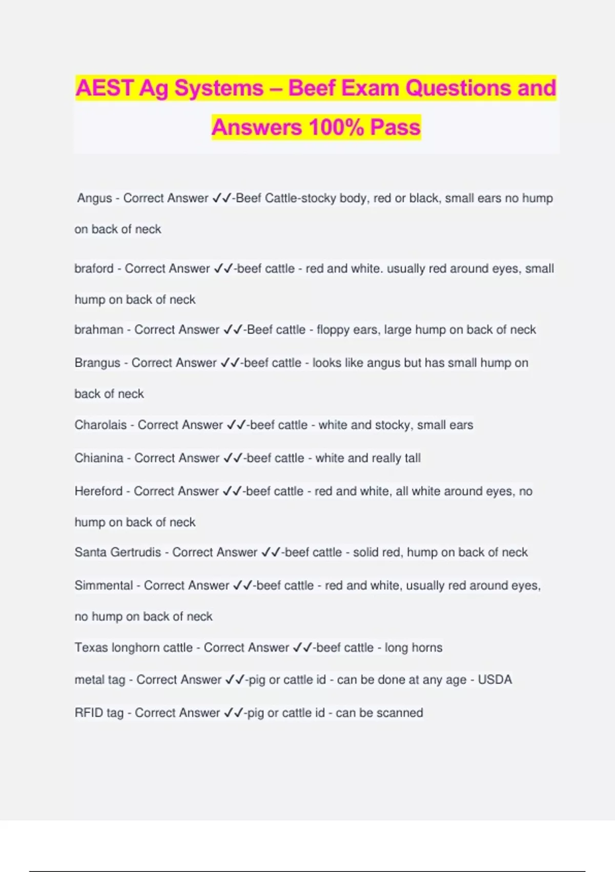 AEST Ag Systems – Beef Exam Questions and Answers 100% Pass Angus - Correct Answer ️️ -Beef Cattle-stocky body, red or black, small ears no hump on back of neck braford - Correct Answer ️️ -beef cattle - red and white. usually red around eyes, small hump on back of neck brahman - Correct Answer ️️ -Beef cattle - floppy ears, large hump on back of neck Brangus - Correct Answer ️️ -beef cattle - looks like angus but has small hump on back of neck Charolais - Correct Answer ️️ -beef cattle - white and stocky, small ears Chianina - Correct Answer ️️ -beef cattle - white and really tall Hereford - Correct Answer ️️ -beef cattle - red and white, all white around eyes, no hump on back of neck Santa Gertrudis - Correct Answer ️️ -beef cattle - solid red, hump on back of neck Simmental - Correct Answer ️️ -beef cattle - red and white, usually red around eyes, no hump on back of neck Texas longhorn cattle - Correct Answer ️️ -beef cattle - long horns metal tag - Correct Answer ️️ -pig or cattle id - can be done at any age - USDA RFID tag - Correct Answer ️️ -pig or cattle id - can be scanned
