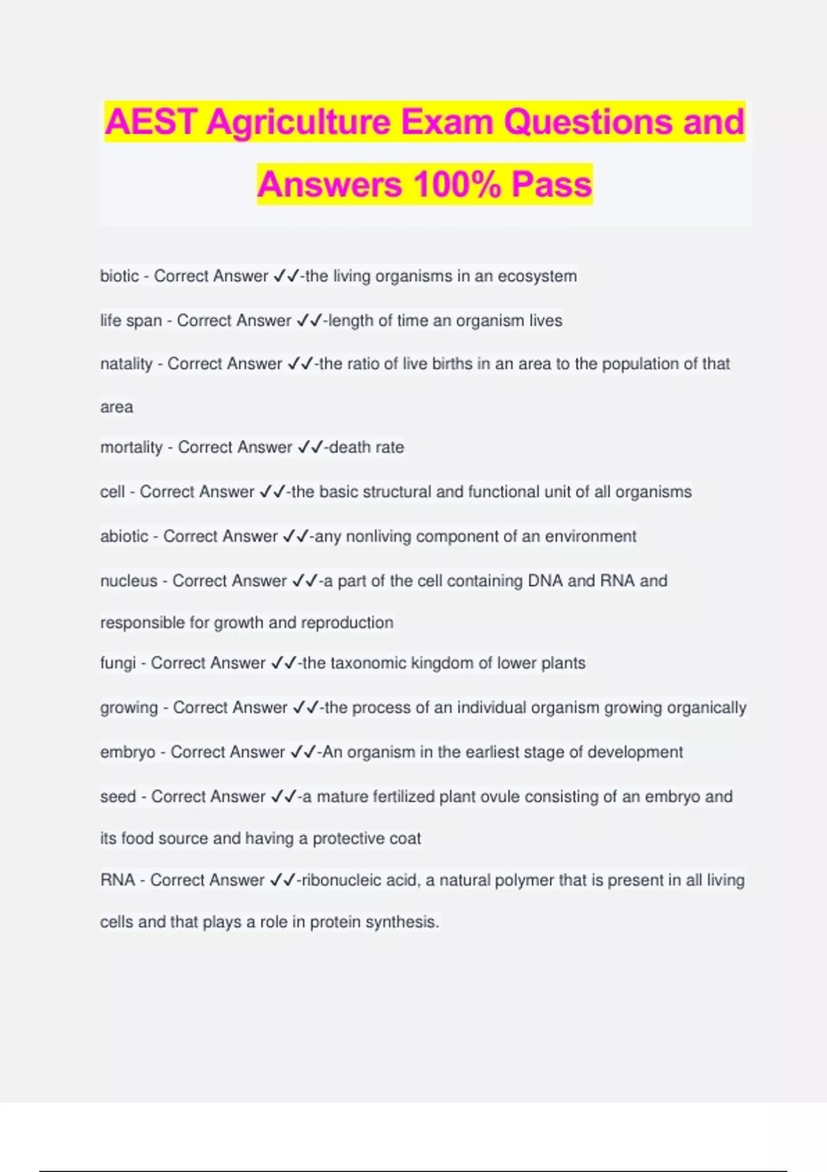 AEST Agriculture Exam Questions and Answers 100% Pass biotic - Correct Answer ️️ -the living organisms in an ecosystem life span - Correct Answer ️️ -length of time an organism lives natality - Correct Answer ️️ -the ratio of live births in an area to the population of that area mortality - Correct Answer ️️ -death rate cell - Correct Answer ️️ -the basic structural and functional unit of all organisms abiotic - Correct Answer ️️ -any nonliving component of an environment nucleus - Correct Answer ️️ -a part of the cell con