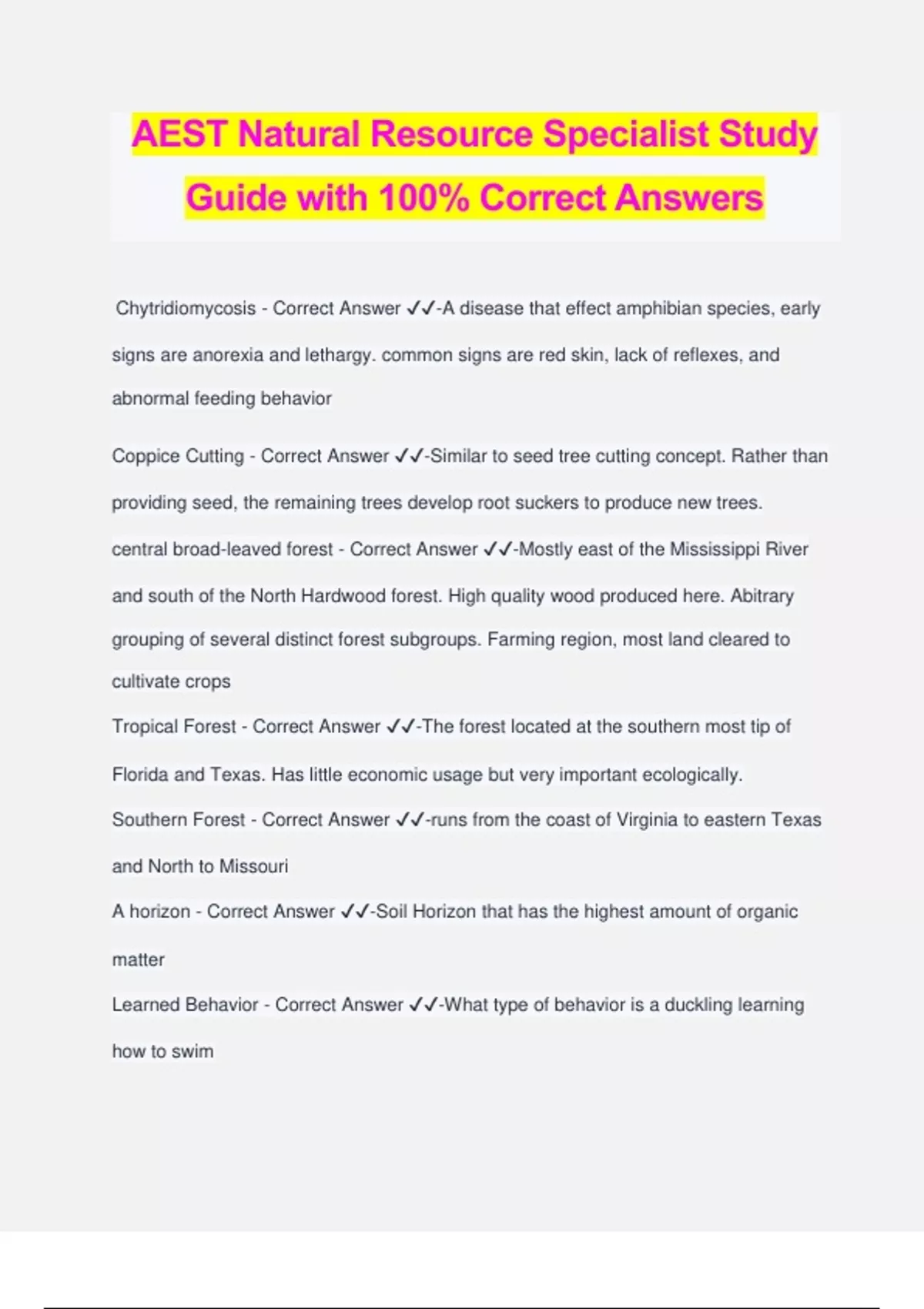 AEST Natural Resource Specialist Study Guide with 100% Correct Answers Chytridiomycosis - Correct Answer ️️ -A disease that effect amphibian species, early signs are anorexia and lethargy. common signs are red skin, lack of reflexes, and abnormal feeding behavior Coppice Cutting - Correct Answer ️️ -Similar to seed tree cutting concept. Rather than providing seed, the remaining trees develop root suckers to produce new trees. central broad-leaved forest - Correct Answer ️️ -Mostly east of the Mississippi River and south of the North Hardwood forest. High quality wood produced here. Abitrary grouping of several distinct forest subgroups. Farming region, most land cleared to cultivate crops Tropical Forest - Correct Answer ️️ -The forest located at the southern most tip of Florida and Texas. Has little economic usage but very important ecologically. Southern Forest - Correct Answer ️️ -runs from the coast of Virginia to eastern Texas and North to Missouri A horizon - Correct Answer ️️ -Soil Horizon that has the highest amount of organic matter Learned Behavior - Correct Answer ️️ -What type of behavior is a duckling learning how to swim adaptive behavior - Correct Answer ️️ -What type of behavior is a deer camouflaging itself from predators Entisols - Correct Answer ️️ -Which soil order has little to no horizon development except the A horizon Alfisols - Correct Answer ️️ -Soil order with lots of clay accumulation and a base saturation of 35% and up Andisols - Correct Answer ️️ -developed from volcanic material, particularly ash Aridisols - Correct Answer ️️ -dry soils found in most desert areas; salinization common Gelisols - Correct Answer ️️ -cold & frozen soils subject to crytoturbation (frost churning); found in high latitudes & elevations, has permafrost in soil Histolsols - Correct Answer ️️ -Soil order high in organic matter Inceptisols - Correct Answer ️️ -soil order with weakly developed horizons but also my have other characteristics of other soil orders Mollisols - Correct Answer ️️ -Soil order with a base saturation of at 50% or above and thick and dark surface horizon Oxisols - Correct Answer ️️ -Soil order with low cation exch